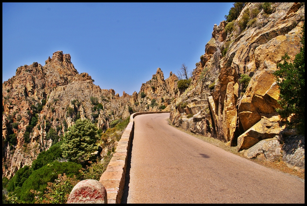 Droga na Korsyce… jedna z główniejszych, po której poruszają się ciężarówki i autokary. Przed każdym takim zakrętem muszą używać klaksonów, by samochody z naprzeciwka się zatrzymały, a najlepiej by uciekały w zatoki.