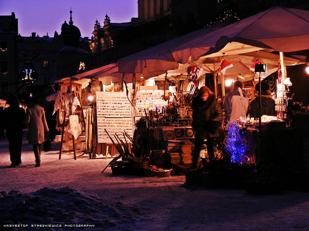 Świąteczne kramy na Rynku Głównym w Krakowie