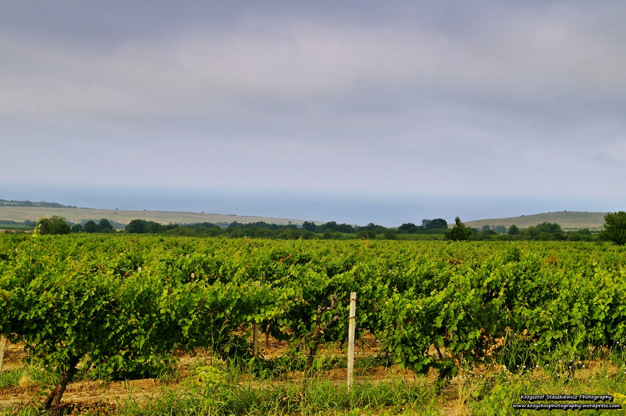 Na zdjęciu, na pierwszym planie winnica, a w tle morze Czarne.