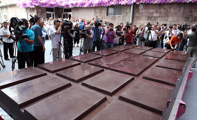 Stworzyli oni tabliczkę czekolady o wymiarach 5600mm x 2750mm x 250mm. Ta tabliczka, a raczej tablica, ważyła… uwaga, uwaga… 4410kg. Na przygotowanie tak ogromnej tabliczki, czy jak kto woli tablicy czekolady firma Grand Candy potrzebowała 4 dni, a według obliczeń specjalistów, przeciętny człowiek potrzebowałby… 450 lat na jej skonsumowanie.
