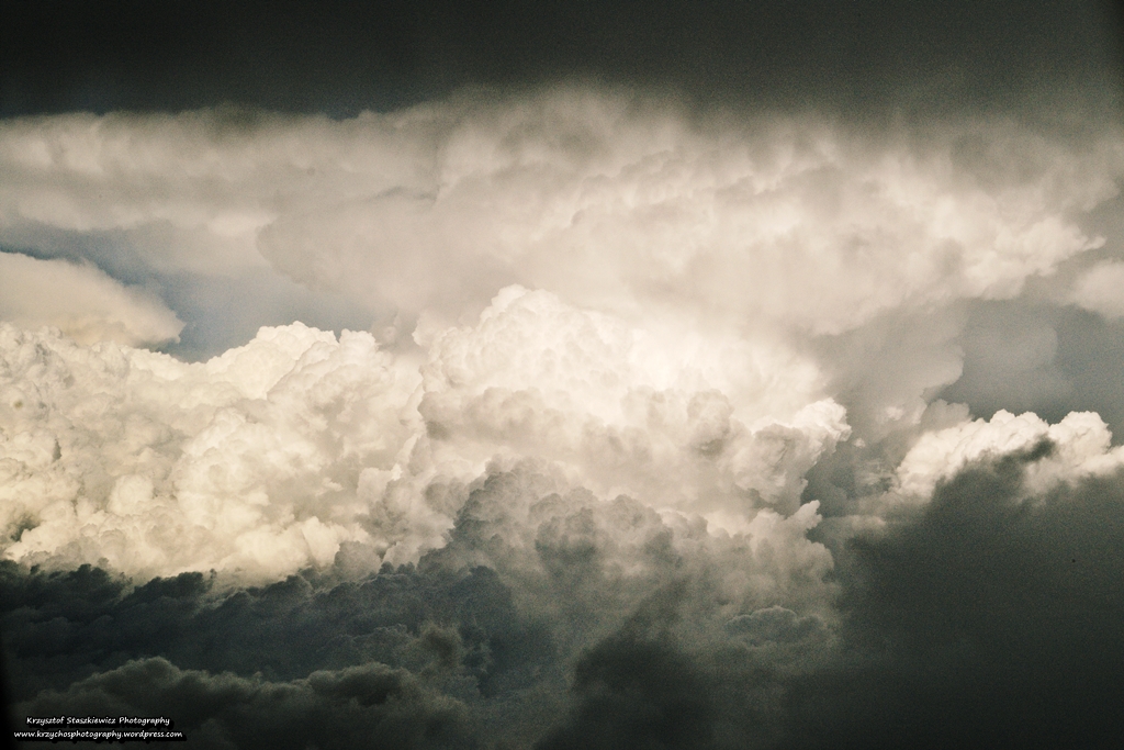 Podczas lotu do Bergamo, natrafiliśmy na niezbyt przyjemną pogodę, przez większość lotu towarzyszyły Nam turbulencje, a zniżanie do lotniska odbywało się tuż koło komórki burzowej, jaka była nad włoskimi Alpami, co powodowało, że gdyby nie pasy, to wszyscy latali by po samolocie. Mimo, że matka natura postanowiła nam zafundować nieprzyjemny lot, to postanowiła też stworzyć nietypowy obraz. Otóż podczas zniżania w pewnym momencie znaleźliśmy się w luce pomiędzy dwiema chmurami. Na chmurę powyżej padał cień (co normalne), z kolei ta chmura, spowodowała, że padał cień na chmurę poniżej, a pozostała część została oświetlona przez słońce, którego światło wpadało przez niewielkie ,,okienko” w chmurach.