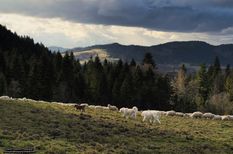 Stado owiec, wraz z pasterskimi psami w Pieninach.