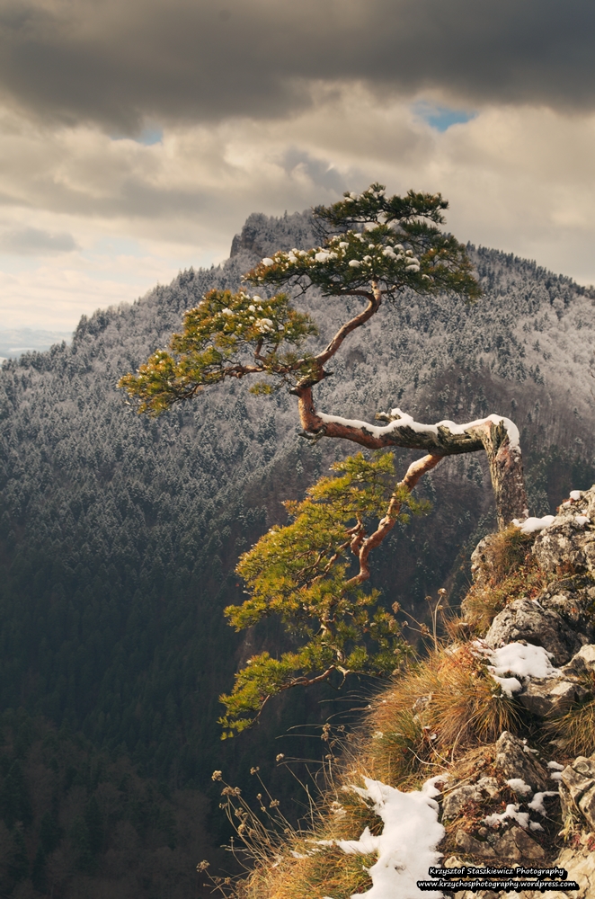 Słynna sosna na Sokolicy, a w tle ośnieżone Trzy Korony.