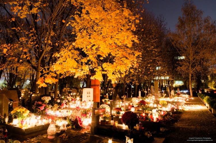 Aleja Zasłużonych wieczorową porą w dzień Zaduszny.