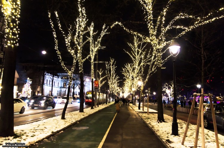 Przepięknie oświetlona ulica Universitätsring w Wiedniu.