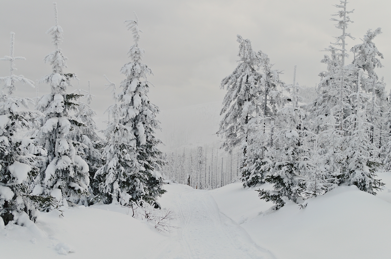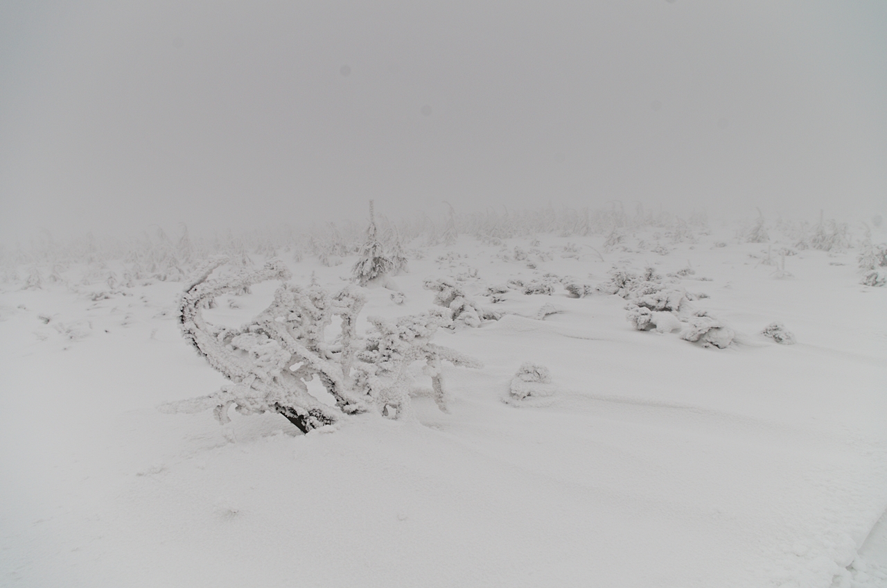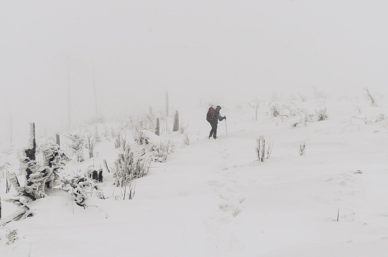 I faktycznie widoki były niesamowite, gdzieś na pięć metrów w przód. Niestety warunki utrudniał jeszcze jeden fakt, otóż oprócz intensywnie padającego śniegu, bardzo mocno wiał wiatr, a szlak ten prowadzi grzbietem, co oznaczało… przebijanie się w śniegu sięgającym po kolana, a nawet czasami i wyżej. Z drugiej strony znów traktowałem to jako świetną przygodę, a ponieważ na tym szlaku prawie nie ma jak się zgubić (są wbite pale, na nich namalowane jest oznaczenie szlaku, zwłaszcza w miejscach, które mogą wprowadzać w błąd).