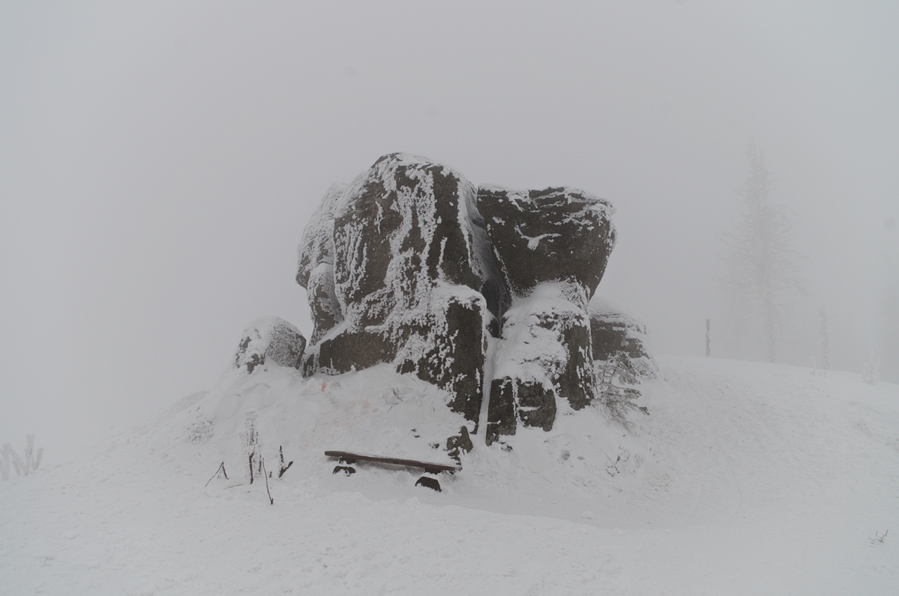 Po około 1,5h przebijania się przez śnieg doszliśmy do Malinowskiej Skały. Na szczycie, jak nieciężko się domyśleć znajduje się skała. Skała ta jest (podobno) całkiem ciekawie uformowana przez erozję (z tym, ze w zimie kompletnie tego nie widać) i stanowi naturalną platformę widokową, na którą z oczywistych względów nie weszliśmy.