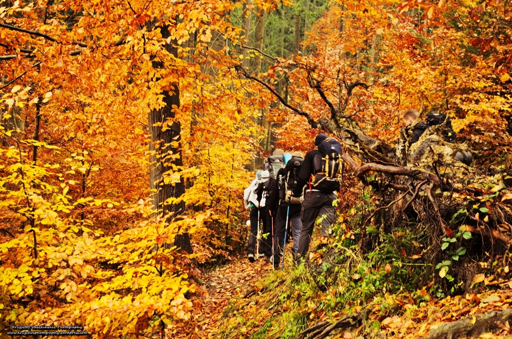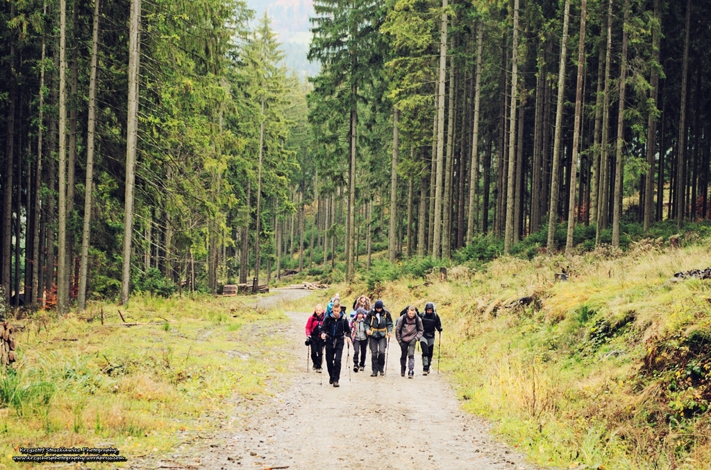 Po wyjściu z autokaru, posileniu się kabanosami oraz wypiciu czegoś na rozgrzewkę, a przede wszystkim odnalezieniu szlaku, zaczęliśmy mozolne podejście pod górkę. Na początku rwałem równo na samym przodzie, po to by zaraz wylądować na samym tyle, a było to spowodowane próbami uwiecznienia pięknej Beskidzkiej jesieni, przy niezbyt sprzyjających warunkach do zdjęć (no bo przecież to nie mogło być spowodowane brakiem kondycji, no absolutnie, no co Wy).