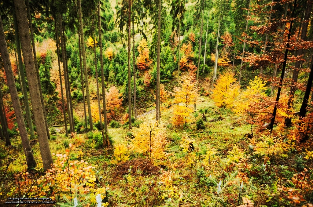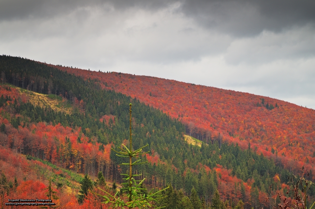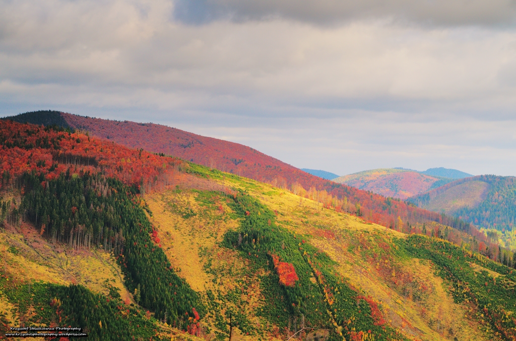 Podczas przejścia do pierwszego punktu wypadu, pogoda wyraźnie pokazała to co ja twierdzę od dawna, czyli to, że jest to bardzo ciężki typ kobiety. Po raz kolejny nie była w stanie się zdecydować, czy woli by było słońce, czy też deszcz i wiatr, więc… postanowiła zrobić mieszankę… zmieniającą się co parę minut. Jednakże mimo swoich humorków, pogoda nie była w stanie zniszczyć przepięknych kolorów jesieni, czegoś dla czego warto wybrać się w Beskidy na jesień, nie zważając na zmęczenie i długie szlaki.