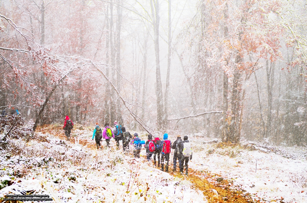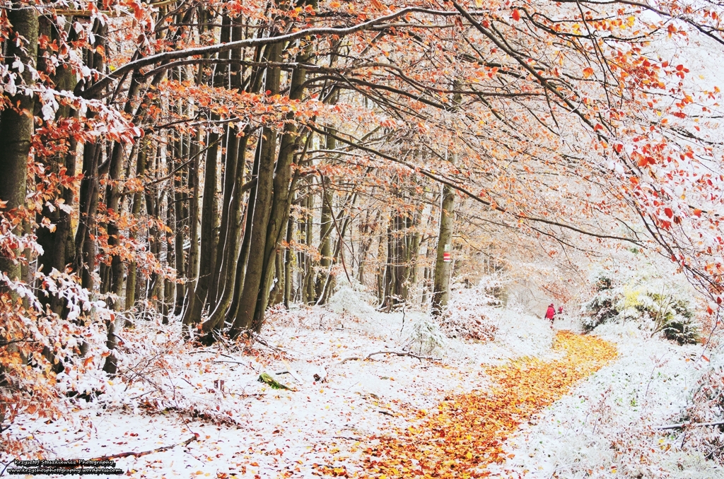 Gdy postanowiliśmy wyjść na szlak, zobaczyliśmy jaką niesamowity klimat stworzyła pogoda. Na około było biało, gdzieniegdzie na śniegu były jesienne liście, a zwłaszcza na szlaku. Można powiedzieć, że matka natura, stwierdziła, że sama wytyczy szlak, oznaczając go liśćmi na śniegu… Tak naprawdę nic nie odda tego widoku lepiej niż zdjęcia. Coś cudownego.