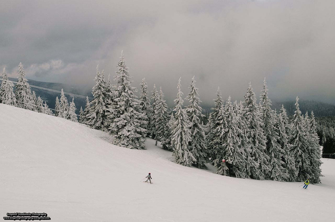 Podczas zejścia na dół postanowiłem w końcu skorzystać z raczków, które zdecydowanie pomogły na wyślizganym szlaku z tym, że…. Po dojściu do górnej stacji wyciągu, postanowiłem siąść na czterech literach i zjechać na dół, minimalizując przy tym ewentualne ryzyko kontuzji, no i co najważniejsze odciążając kolana, no bo skoro jest taka możliwość to czemu nie? Z tym, że nie pomyślałem (jak to zwykle ja), że na tak twardym śniegu, jedynym skutecznym narzędziem hamowania jest… czekan, którego oczywiście nie mam, nawet nie mam go w domu. Zważając na powyższy fakt, że jedyne czym mogłem hamować to sobą, a to narzędzie jest dosyć słabe, toteż stok narciarski przeciąłem w dosyć szybkim tempie, jednocześnie krzycząc niecenzuralne słowo na ,,k”, tak by zwrócić uwagę narciarzy, by jednak może poczekali aż przeskoczę stok (tak po drodze miałem hopkę). Ostatecznie udało się wyhamować parę metrów od stoku i od tego momentu postanowiłem kulturalnie zejść spacerem do schroniska. Ale w sumie pomimo pewnego ryzyka bardzo pozytywnie wspominam ten odpał.