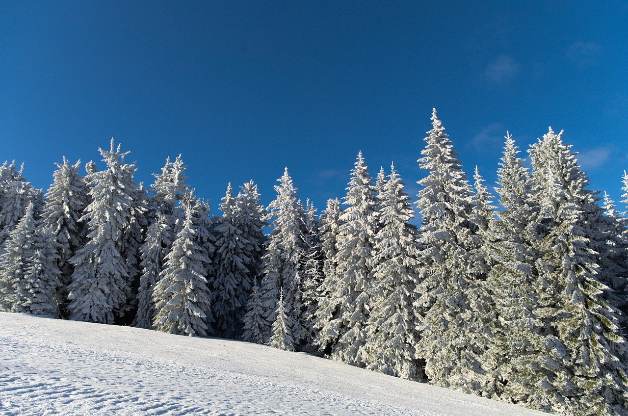 Początkowo szlak prowadził nas asfaltem do parkingu przy wyciągu narciarskim. Następnie szlak odbił w prawo i zaczęło się podejście, które w kilku miejscach przecinało stok narciarski, na którym narciarzy było tylko kilku. Związane to było z tym, że poprzednie dni były stosunkowo ciepłe i śniegu było jak na lekarstwo. Minusem z kolei był fakt, że trzeba było podchodzić po sztucznie nasypanym (i sypanym dalej, zresztą trudno się dziwić) śniegu, a uwierzcie po tym się bardzo słabo podchodzi pod górę.