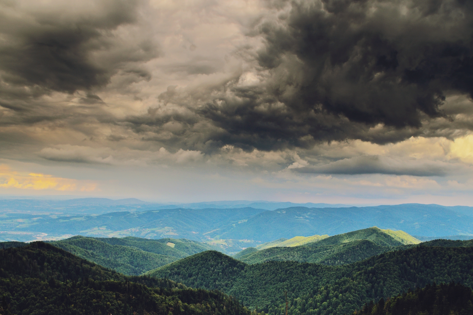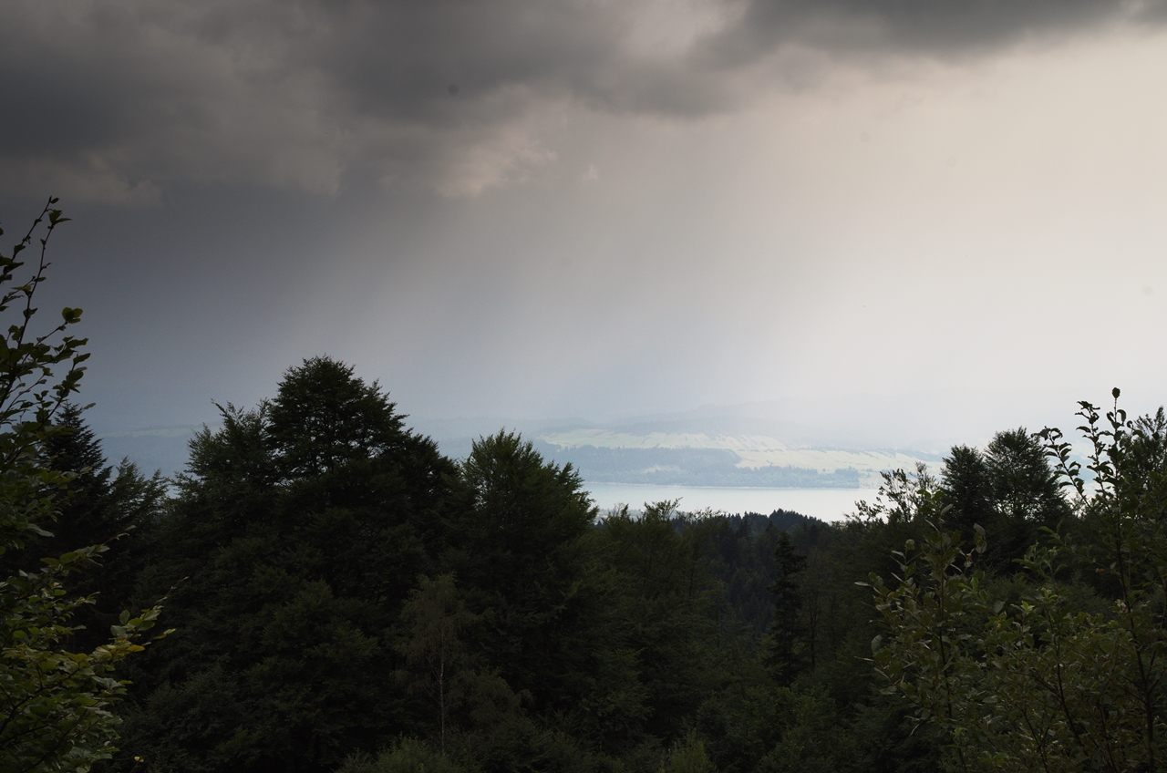 Idąc wyjątkowo szybkim tempem, próbowaliśmy uciec przed burzowymi chmurami, nawet nie przeszkadzały nam coraz większe podejścia, związane z wyjściem na Runek i… prawie się udało. Burza złapała nas jakieś 3km przed Bazą, konkretnie w okolicy Polany Kudów. Na szczęście w tym miejscu szlak prowadzi w bardzo gęstym lesie (parę metrów od polany). Szybka instrukcja, wyłącznie wszelkich urządzeń elektronicznych, odsunięcie plecaka o paręnaście metrów, a sami kucamy. Na szczęście sama burza nie była gwałtowana, w sumie to w okolicy Polany nie zauważyłem żadnych piorunów, natomiast ulewa była solidna.
