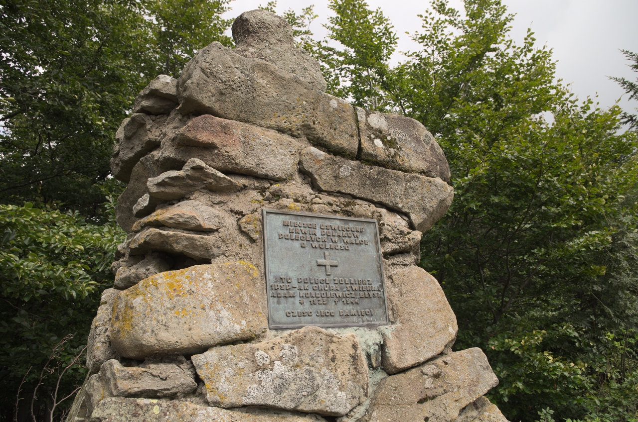 Do Obidowca towarzyszy nam zielony szlak, później na polanie on odbija w lewo na Tobołów, a nasz, czerwony szlak, idzie dalej pod górę, aczkolwiek to podejście jest banalnie proste. Z Obidowca, jeszcze parę lat temu można było zobaczyć Tatry, niestety w międzyczasie drzewa podrosły (niewiele, ale mimo wszystko) i teraz widać już tylko pojedyncze wierzchołki. Parę minut później dotarliśmy do miejsca, które jest dość ważne, a już z pewnością dla osób, którzy interesują się lotnictwem. Otóż to tutaj, niedaleko polany Giecka, w maju 1973r. rozbił się samolot sanitarny, konkretnie L-200 Morava. który transportował chore dziecko do Nowego Targu. Obecnie w tym miejscu znajduje się pomnik, który upamiętnia to zdarzenie.
