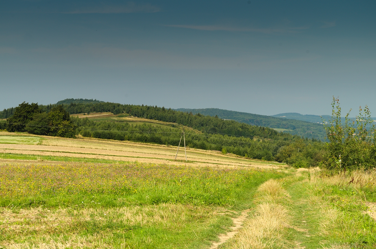 Niedługo później szlak zaczął robić się bardzo widokowy, sama przyjemność dla oczu… niestety po tej przyjemności czekał nas pierwszy horror dla stóp, otóż pojawił się wróg numer jeden, asfalt… Na długości 3,5km. Ale z drugiej strony dzięki temu trafiliśmy do sklepu, w którym zakupiliśmy sobie to czego nam brakowało (tzn przede wszystkim woda, dużo wody). Przy okazji okazało się, że sklep prowadzi sołtys, z którym zamieniliśmy parę miłych słów, on nas ostrzegł przez dzikimi zwierzętami i dzikimi miejscowymi (czytaj pijakami, którzy moim zdaniem są dużo większym zagrożeniem podczas spania w namiocie niż jakikolwiek dziki zwierzak).