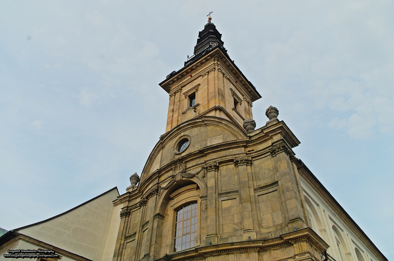 Na szczycie odpuściliśmy sobie ponowne płacenie za zobaczenie Gołoborzy, ale za to nie odpuściliśmy sobie zobaczenia klasztoru. Bazylika mniejsza pw. Trójcy Świętej i sanktuarium Relikwii Drzewa Krzyża Świętego jest najstarszym sanktuarium w Polsce. Budowa została zakończona w 1789r. Jest to bardzo skromna świątynia, natomiast obrazy, które ozdabiają całą świątynie są naprawdę ładne. Długo w bazylice nie byliśmy, bo popatrzyliśmy tylko jak wygląda, pomodliliśmy się i wyszliśmy na zewnątrz, gdzie na dłuższą chwilę usiedliśmy na trawie i podziwialiśmy widoki.