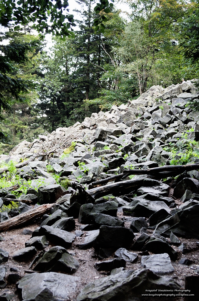 W końcu doszliśmy do wejścia do Świętokrzyskiego Parku Narodowego. To tutaj czekało na nas najcięższe podejście na całym szlaku, podejście na Łysicę, czyli na najwyższy szczyt Gór Świętokrzyskich. Na dystansie 1,8km, szlak wspina się 237m w górę. Trochę mi brakowało takich podejść, chociaż nie ma co ukrywać, że z takimi plecakami trochę było męczące. Zresztą dość znacznie się wyróżnialiśmy na szlaku, no bo szlak jest łatwy, 2h w obie strony, no to typowi turyści (których była cała masa) byli ubrani w adidasy, mały plecak, ew nawet tylko butelka wody i wsio, a my buty górskie, już widać po nas, że to nie pierwszy dzień, a na plecach ,,pociąg towarowy”, jak to genialnie określił przemiły Pan, z którym mieliśmy okazję pogadać podczas całego podejścia na szczyt. Po 45min byliśmy już na szczycie i podziwialiśmy ogromne gołoborze.