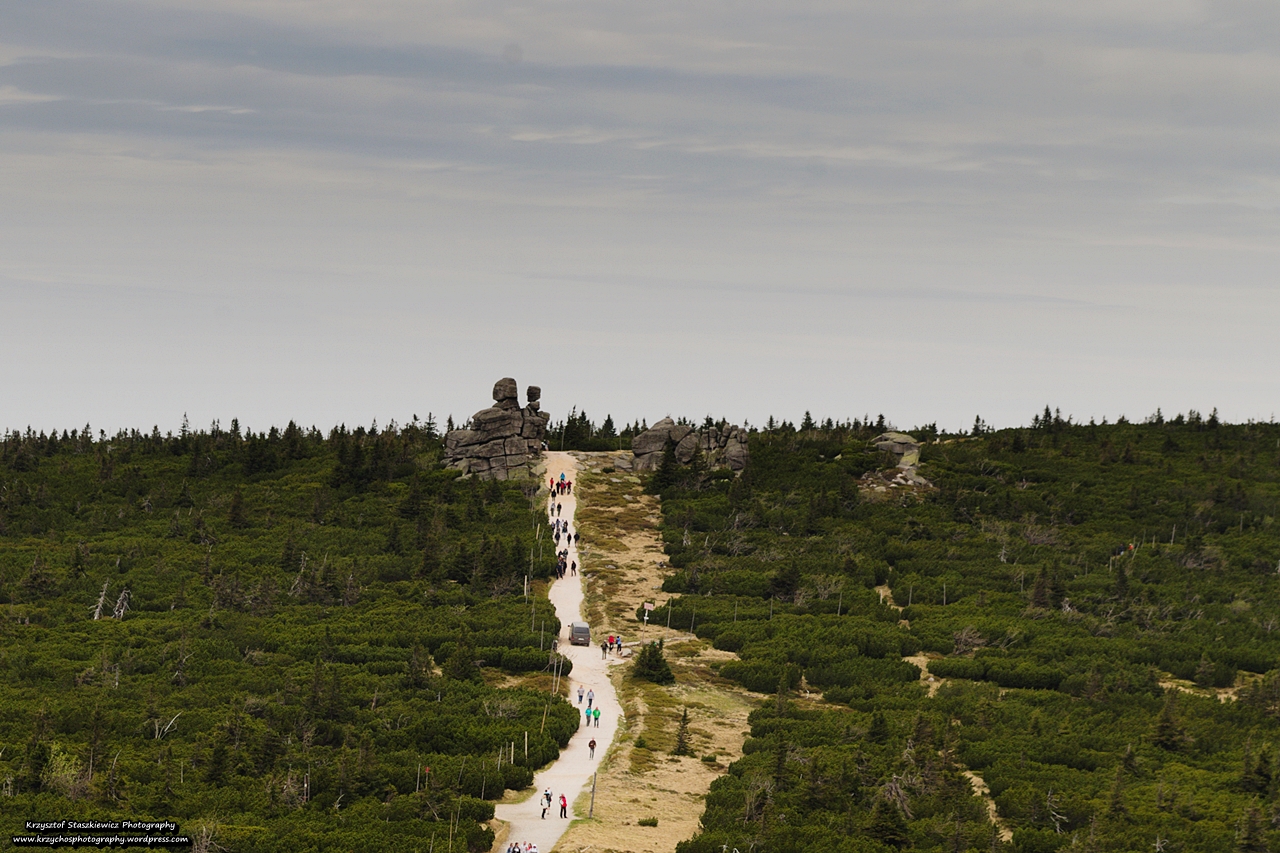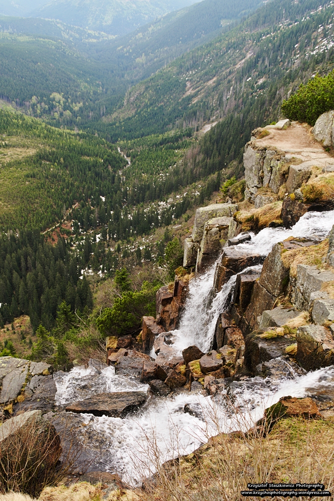 Przejście przez Szklarską Porębę odbyło się dosyć sprawnie i po chwili przywitaliśmy się z Karkonoskim Parkiem Narodowym, przy okazji mijając po lewej stronie Wodospad Kamieńczyka, który jest najwyższym wodospadem po Polskiej stronie Karkonoszy, ma on 27m wysokości i wpada do przepięknego Wąwozu Kamieńczyka. Jak bardzo pięknego? Tak bardzo, że były w nim kręcone sceny do ,,Opowieści z Narni”. My niestety spóźniliśmy się i ,,drzwi do Narni” zostały zamknięte przed naszym przybyciem. W związku z czym ruszyliśmy stromo pod górę, klnąc pod nosem na ułożoną kostkę chodnikową, przez które nasze stopy bardzo mocno cierpiały, zwłaszcza, że miały za sobą już ponad 23km marszu, a teraz jeszcze plecaki były dociążone zapasami.