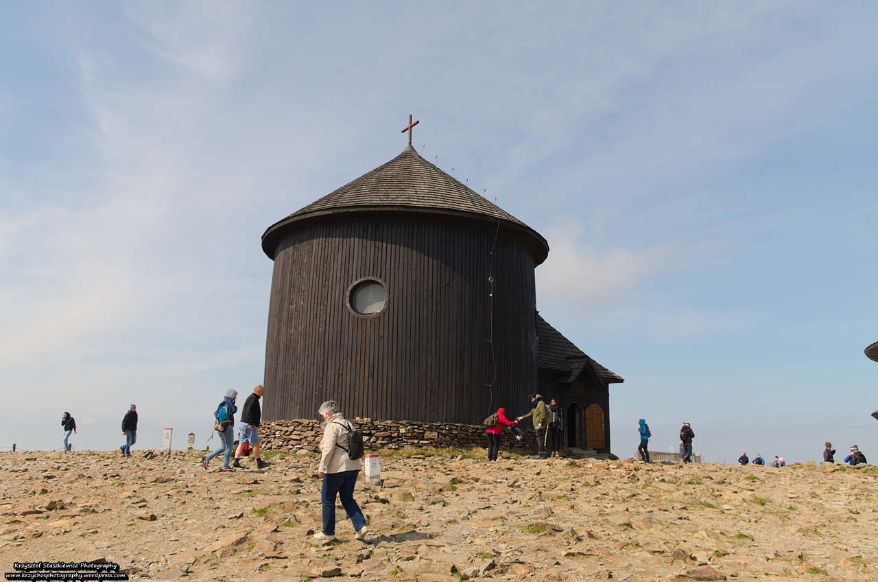 Przed nami było ostatnie podejście na szczyt, które nawet dosyć płynnie udało mi się pokonać, myślałem, że będzie gorzej na nim. Na szczycie oczywiście wiało, no ale cóż… na Śnieżce wieje 300 dni w roku, tym bardziej dziwi fakt, że udało się na nim zbudować cokolwiek, a jest tam kapliczka, była restauracja, stacja meteo, a od strony Czeskiej budynek kolejki gondolowej. No ale nic, grunt, że trafiliśmy na jeden z około 75 dni w roku, w którym nie ma mgły i widoki były fenomenalne. Na szczycie zrobiliśmy sobie jeszcze zdjęcie grupowe i zadowoleni ze zdobycia jednego ze szczytów do Korony Gór Polski i do Korony Gór Europy, ruszyliśmy w dół, tym razem szlakiem okrężnym.