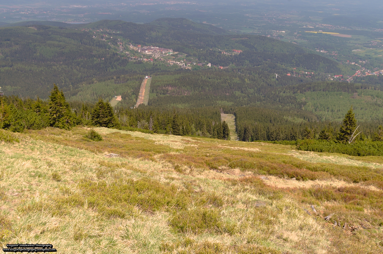 Po zejściu do Domu Śląskiego mieliśmy wrócić na Główny Szlak Sudecki, odbijając w prawo w kierunku Karpacza, tyle, że… Szlak z nieznanych mi powodów był zamknięty. Część grupy ruszyła nim mimo wszystko, a ja z jedną osobą postanowiliśmy zrobić jego obejście… Ale koniec końców, również wylądowaliśmy poza szlakiem, bo postanowiliśmy chaszczować po stoku narciarskim. Było ciekawie, zwłaszcza, w momencie, gdy usłyszeliśmy warczenie z lasu. Swoją drogą zrobiliśmy niezłą sensację wśród ludzi będących na wyciągu krzesełkowym, którym wyjeżdża się z Karpacza na Kopę. ,,To tędy prowadzi szlak?” cóż no nie prowadzi, proszę szanownych turystów, ale wolimy iść trasą narciarską, gdzie jest miękko, niż iść po kamieniach na dół.