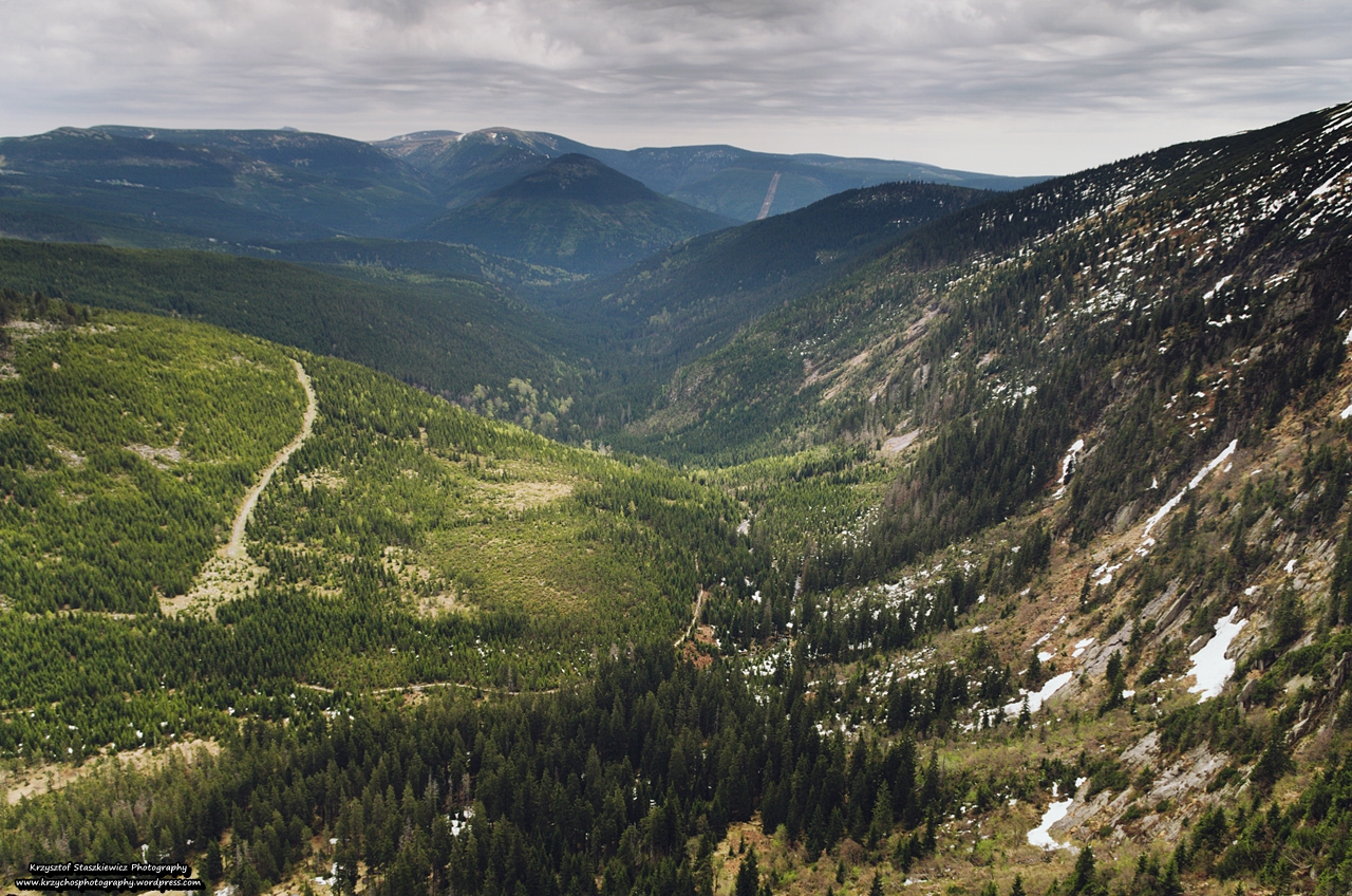 Powrót do Polski lekki nie był, a to za sprawą podejścia na Śnieżne Kotły, ale również i tym razem widoki wynagrodziły cały wysiłek, po prostu miazga. Następnie ruszyliśmy za tłumem, żółtym szlakiem do Schroniska Pod Łabskim Szczytem, nie zauważając znaku z informacją o zamknięciu szlaku (szkoda, że na stronie KPN jest informacja o zamknięciu szlaku poniżej Śnieżnych Kotłów, a na temat żółtego szlaku nie ma słowa). Na szlaku okazało się, że… mamy do przejścia kilka płatów śniegu, na szczęście mokrego, więc ryzyko upadku było stosunkowo małe (zwłaszcza, jeżeli szło się poza wydeptaną ścieżką).