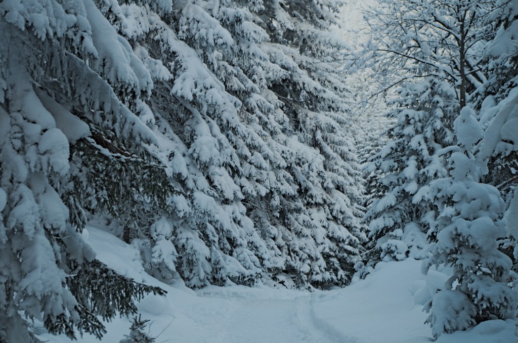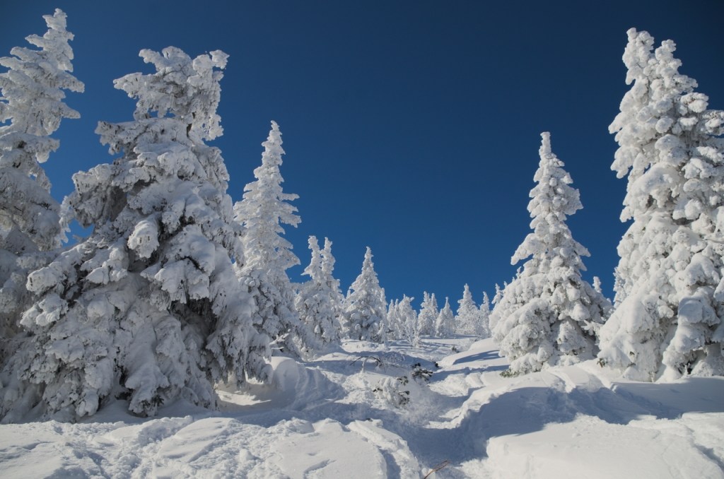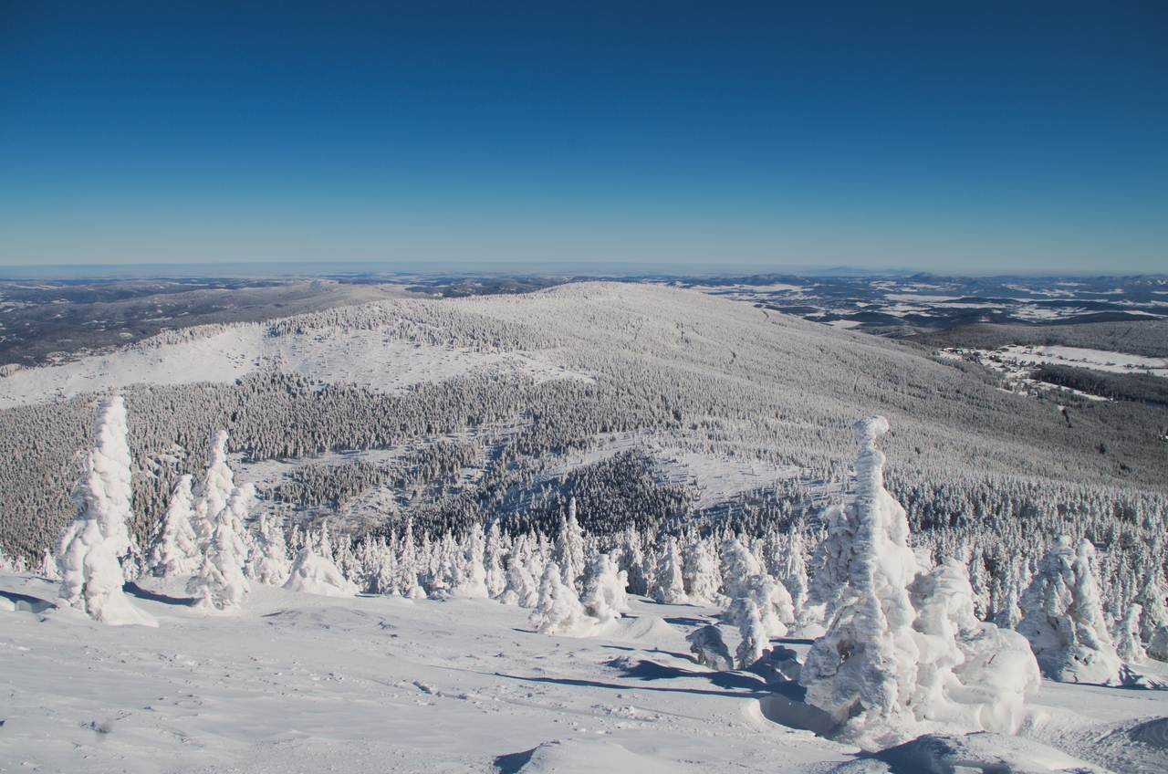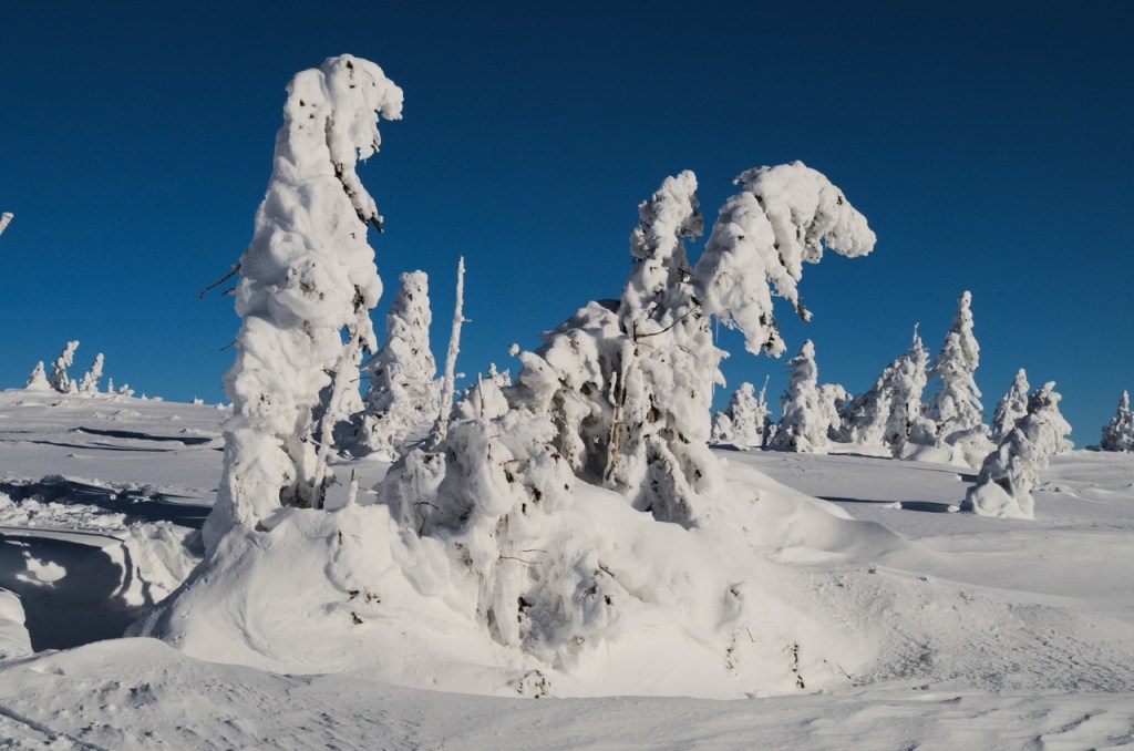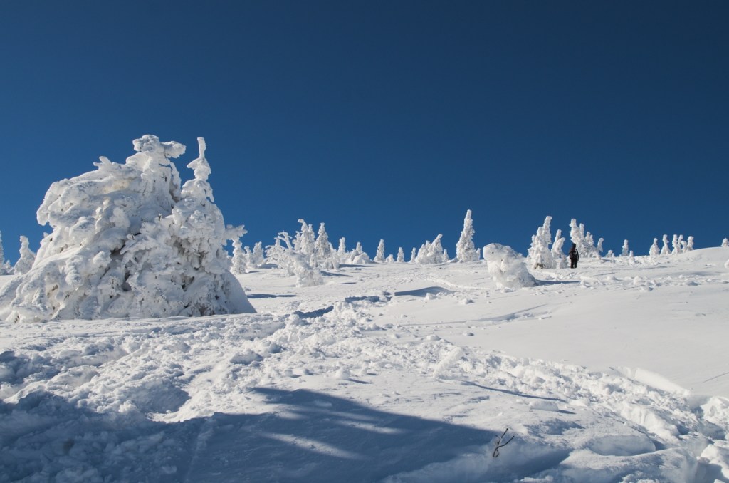 Tuż przed wyjściem na Sowią Przełęcz doszedłem do punktu, w którym jest pas martwego drzewostanu, zniszczonego ponad 30 lat temu przez kornika. W tym miejscu zaczynają się bajeczne widoki. Ośnieżone resztki drzew, które nie poddały się kornikowi, albo zaczynają odrastać, perfekcyjnie kontrastujące z błękitem nieba.