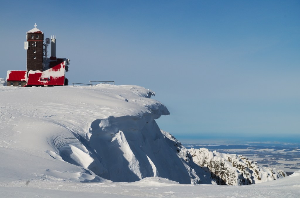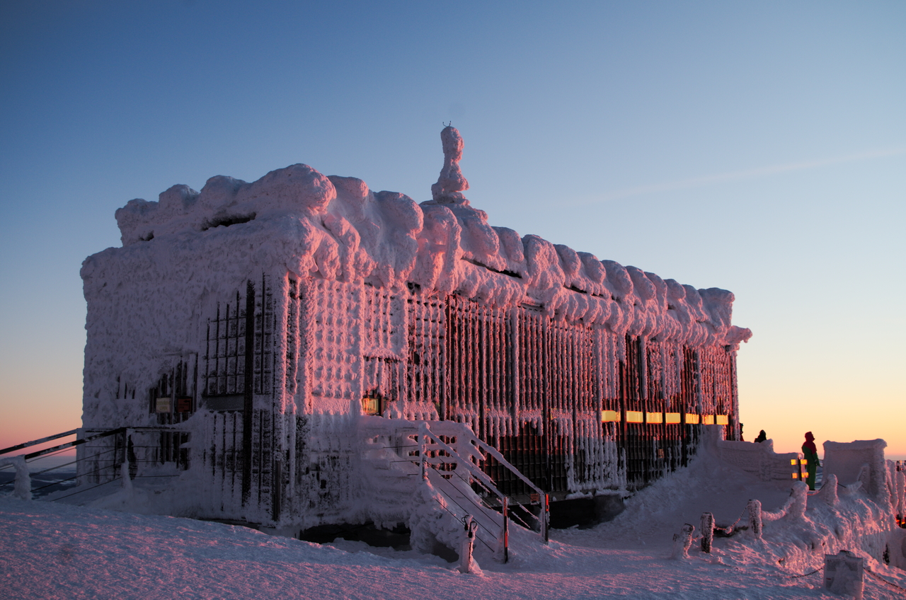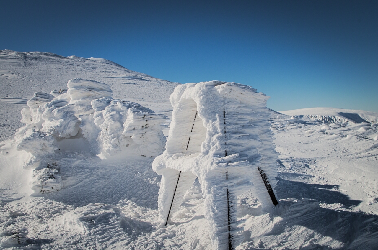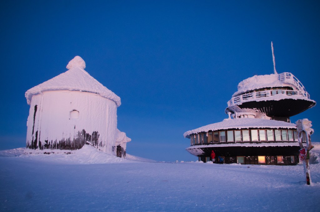 Na szczycie Śnieżki znajduje się kilka budynków, w tym po stronie polskiej: Kaplica Świętego Wawrzyńca z 1665 roku oraz Obserwatorium Wysokogórskie IMGW, a po stronie czeskiej: budynek Czeskiej Poczty oraz górna stacja kolejki linowej. Wszystkie te budynki były magicznie oszronione. Na samym szczycie nie wytrzymałem długo, mocno w kość dawał wiatr wiejący z prędkością około 72km/h przy temperaturze -15st. Ale wiedziałem, że jeszcze co najmniej raz pojawię się na Śnieżce podczas tego wyjazdu, ale o tym później.
