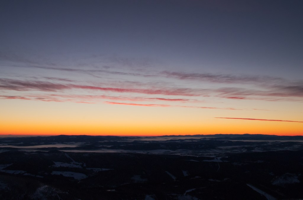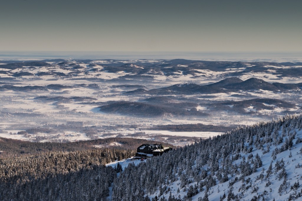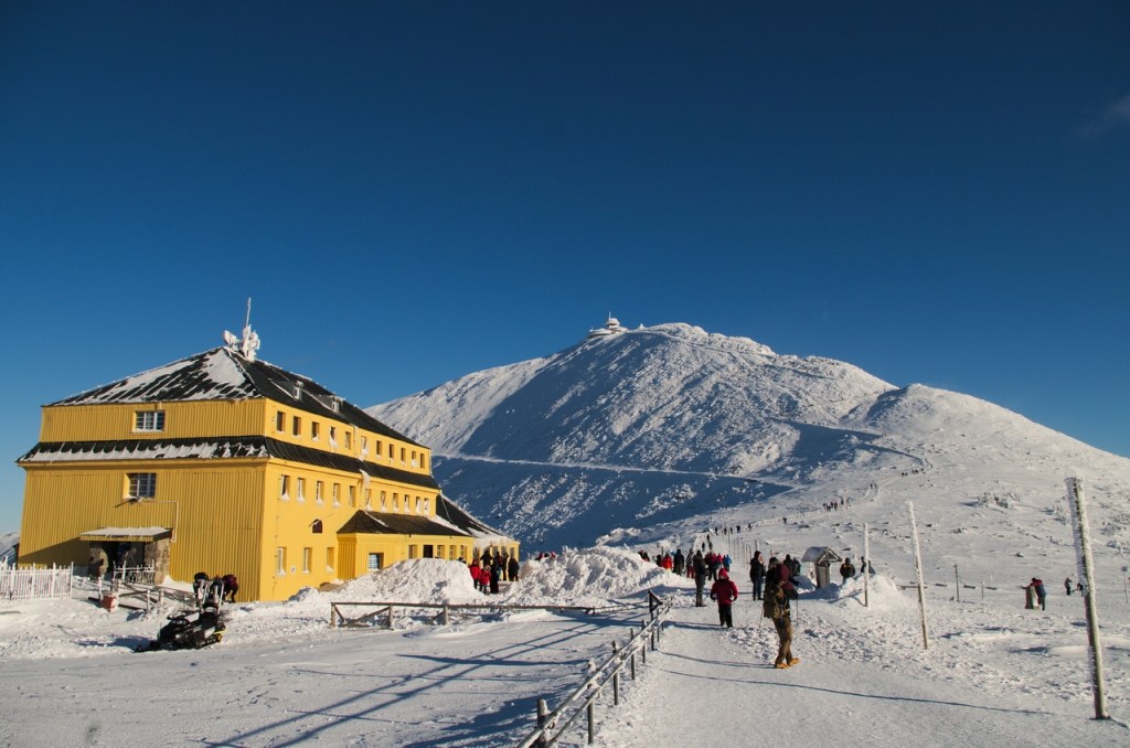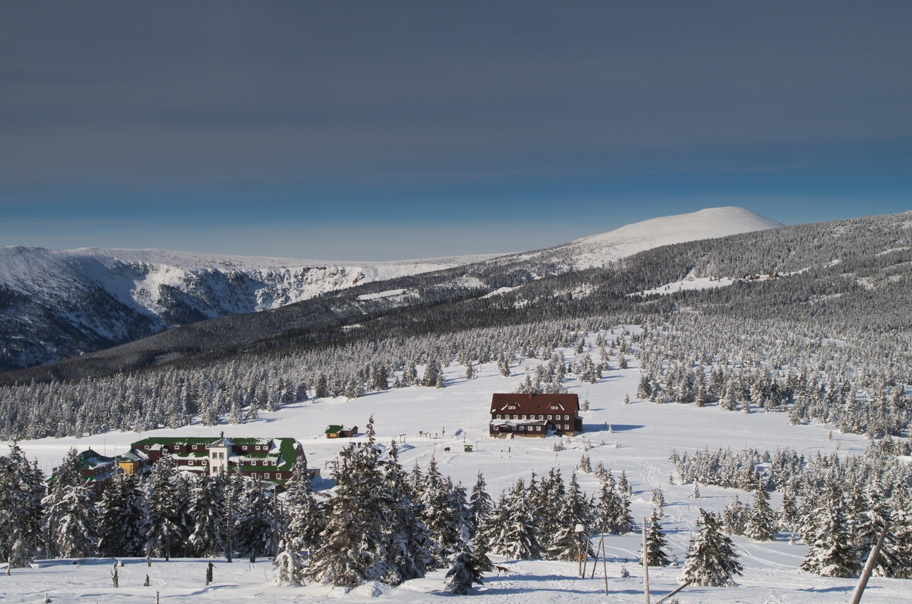 Chwilę później doszedłem do czeskiego schroniska Jelenka. Zrobiłem tam kilka zdjęć, wypiłem łyk gorącej herbaty i ruszyłem na podejście na Czarną Kopę. Tam też moim oczom okazały się przecudowne widoki. Z jednej strony widok na Przełęcz Sowią i Skalny Stół, a z drugiej strony widok na królową Karkonoszy – Śnieżkę.