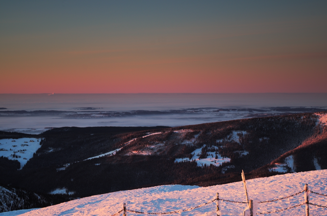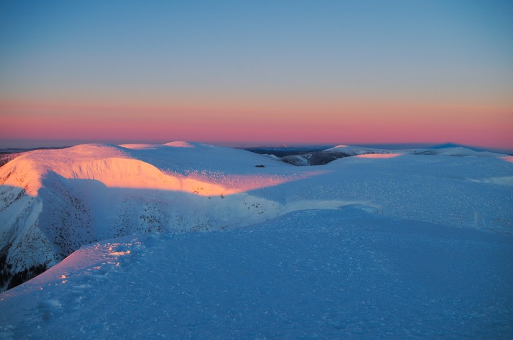 Na miejscu okazało się, że oprócz mnie, na szczyt wyszło jeszcze kilka osób. Wszyscy zdawaliśmy sobie sprawę z tego, że ten wschód będzie niesamowity. W dolinach mgła, niebo niemal całkiem bezchmurne. Około godziny siódmej z minutami zza horyzontu, zaczęło pojawiać się słońce, w niemal płonącej barwie. W tym momencie wszyscy, którzy byli na kopule szczytowej zaczęli biegać wokół niej. I to nie dlatego, że było zimno, tylko dlatego, że nie wiadomo było, co jest warte większej uwagi, czy sam wschód słońca, czy oszronione budynki, które były pięknie oświetlane przez słońce, czy Równia pod Śnieżką, na której pojawił się cień szczytu.