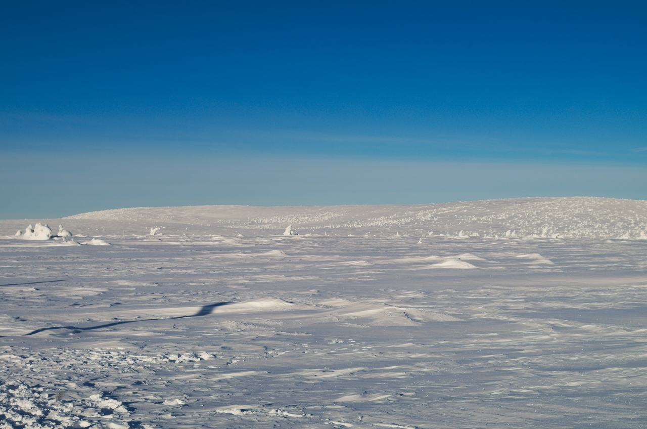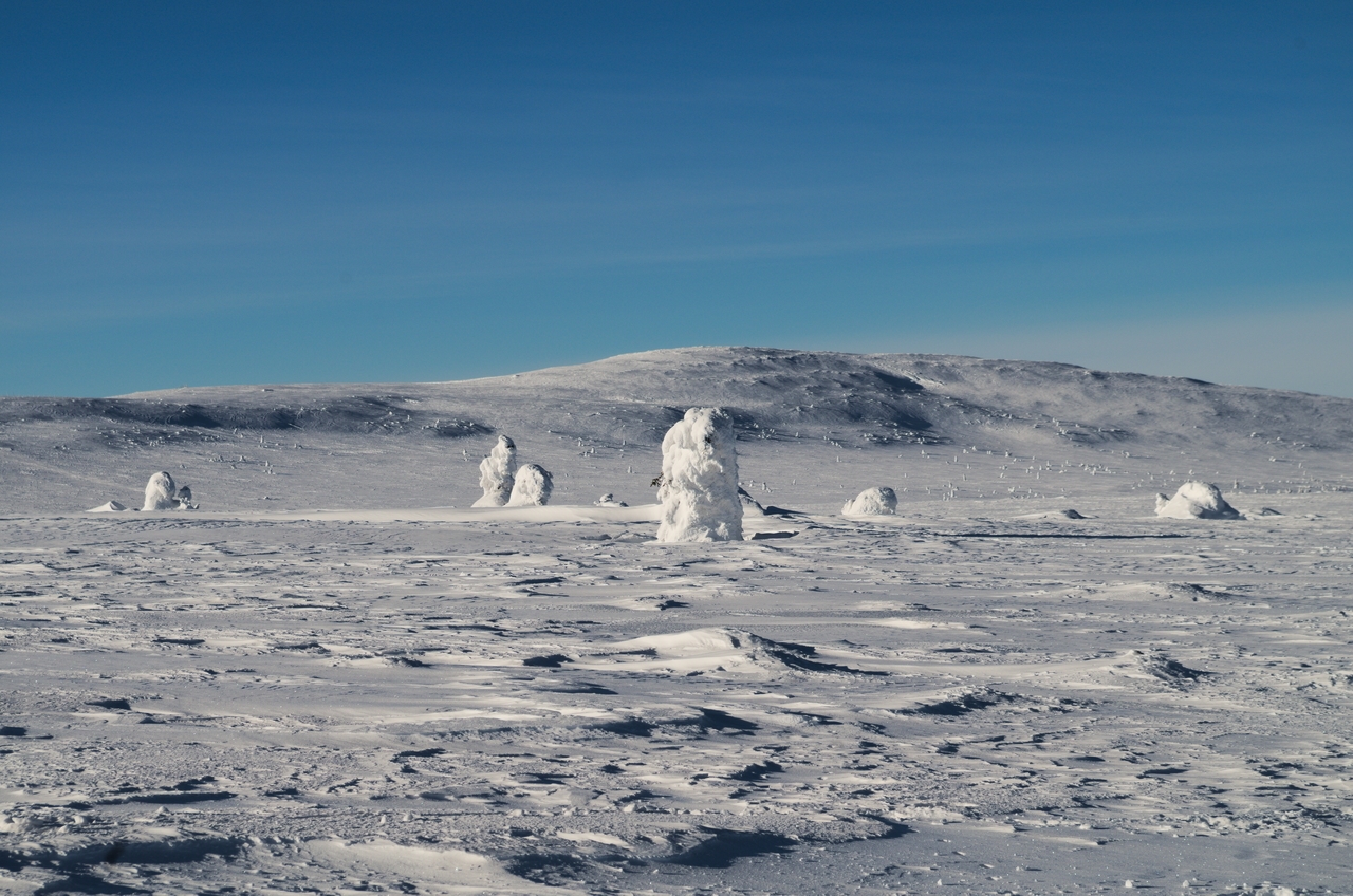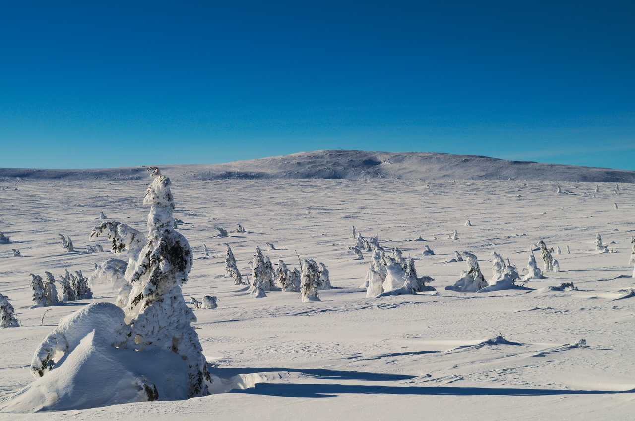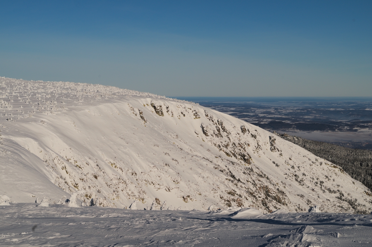 Po dojściu do centralnego punktu Równi pod Śnieżką moim oczom ukazał się niesamowity krajobraz. Pustki, otaczał mnie tylko śnieg, wszędzie biało, spod śniegu wystawały gdzieniegdzie niezwykłe ,,rzeźby”, które stworzył na drzewach śnieg, mróz i wiatr. Z tego co pamiętałem, to nawet w lecie klimat Równi jest niesamowity, ale w zimie czujesz się, jakbyś był gdzieś w środku ogromnego pasma górskiego, bez dostępu do cywilizacji. A tymczasem mówimy tutaj o miejscu, w którym od cywilizacji dzieli nas jakieś półtorej godziny zejścia w dół.