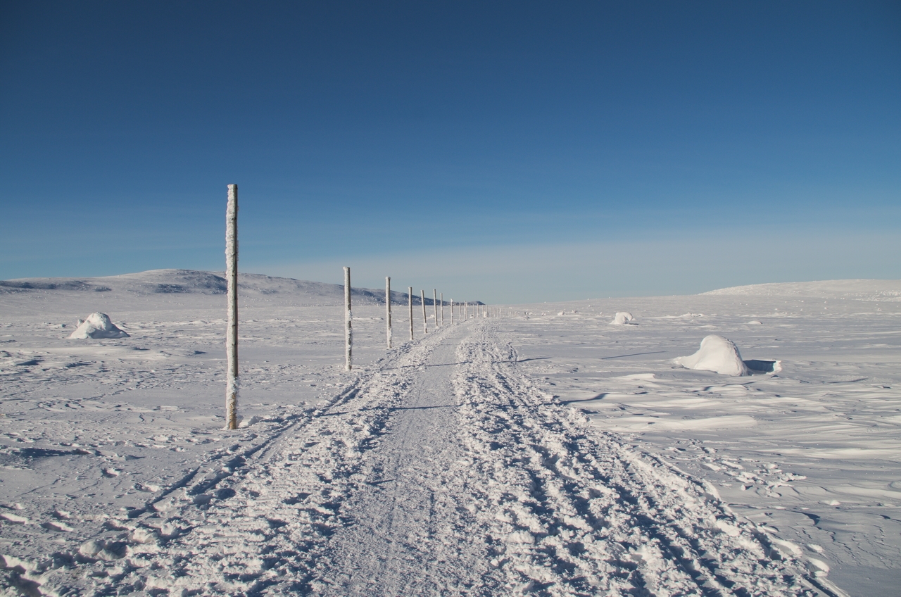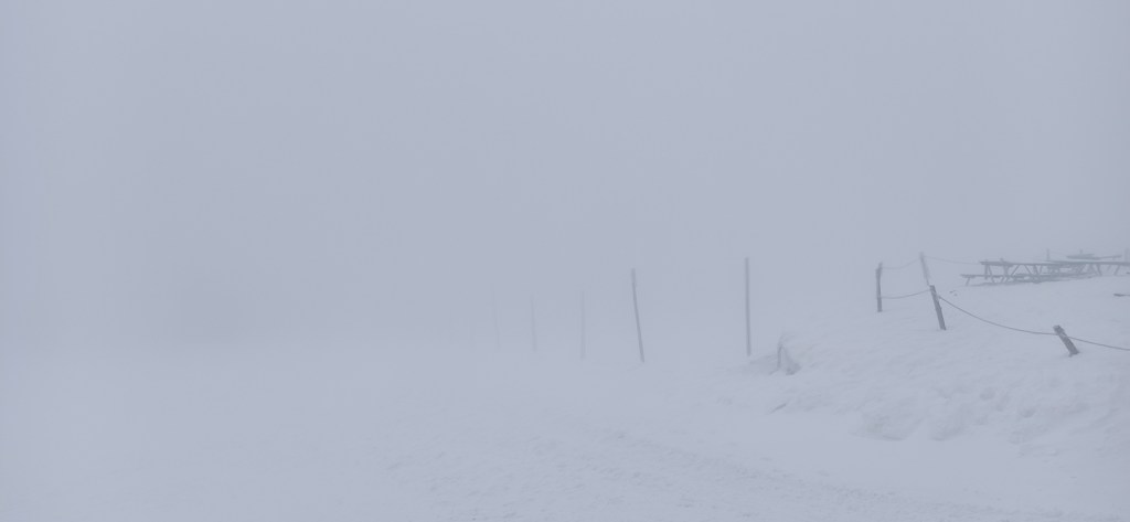 Pogoda tego dnia raczej mało zachęcała do wyjścia ze schroniska, bowiem nic nie było widać. Zacząłem doceniać to, że KPN pomyślał o wbijaniu tyczek wzdłuż szlaku, inaczej nie miałbym najmniejszej szansy, by znaleźć szlak do granicy lasu.