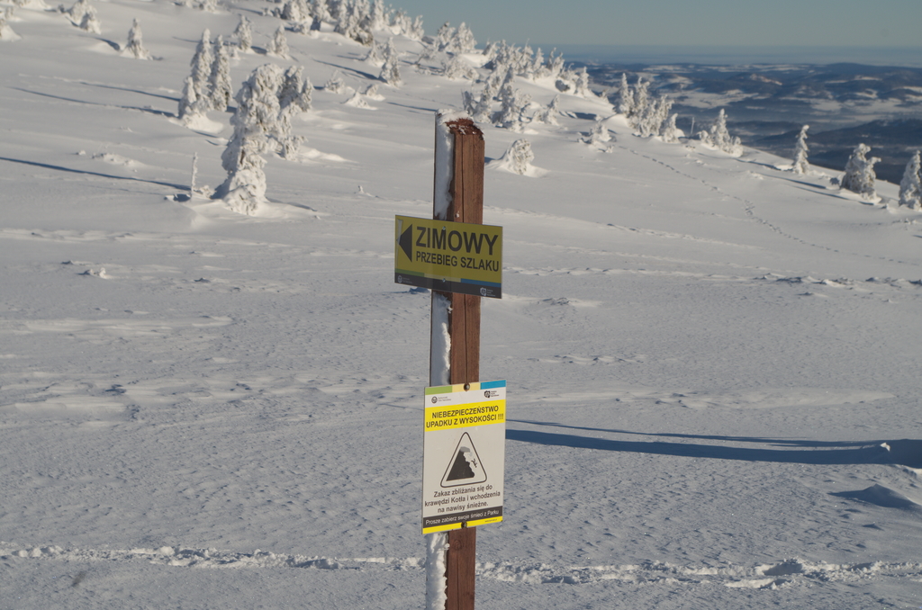 Gdy tak sobie maszerowałem doszedłem do miejsca, w którym zimowy wariant szlaku oddziela się od tego letniego. Mowa tutaj o szlaku prowadzącym wzdłuż krawędzi Kotłów Małego i Wielkiego Stawu. W zimie szlak ten jest poprowadzony w odległości około dwustu metrów od krawędzi Kotłów. Co prawda w końcowej części obejścia, jesteśmy już tylko parę metrów od platformy widokowej nad Kotłem Wielkiego Stawu, widać też, że sporo osób wchodzi na tą platformę (mocno wydeptany śnieg), to jednak wolałem nie ryzykować i nie zbliżać się do krawędzi, tym bardziej, że nie miałem pojęcia w jakim stanie jest śnieg, czy nie ma tam jakiegoś nawisu śnieżnego, a co za tym idzie czy nie ma ryzyka lawiny.