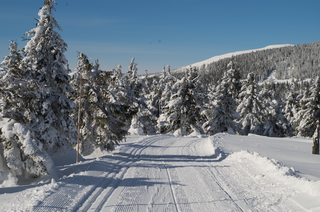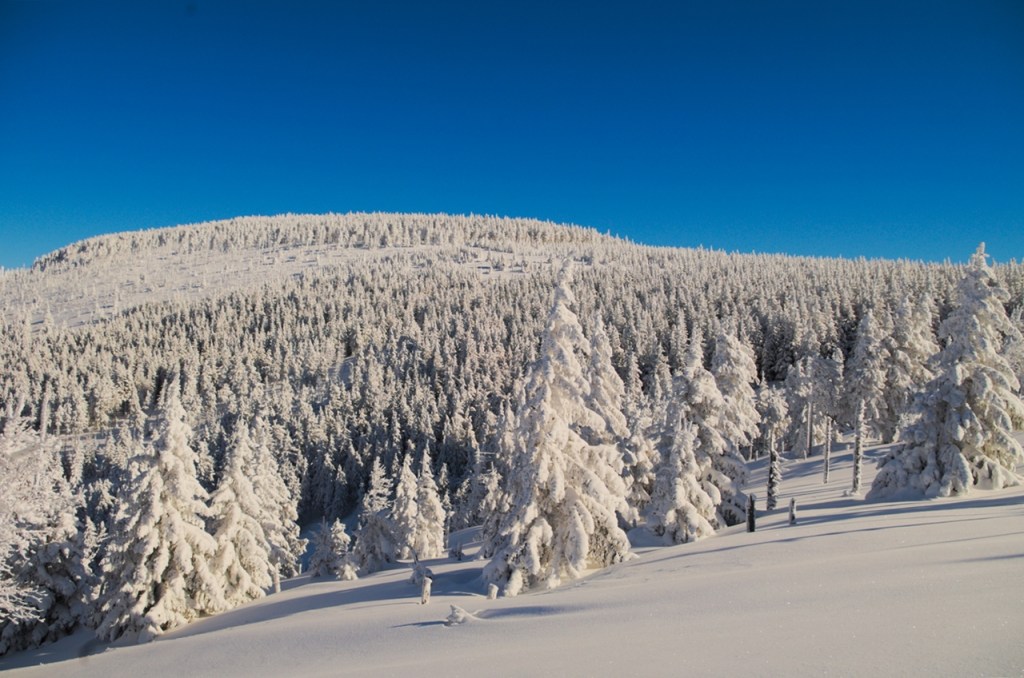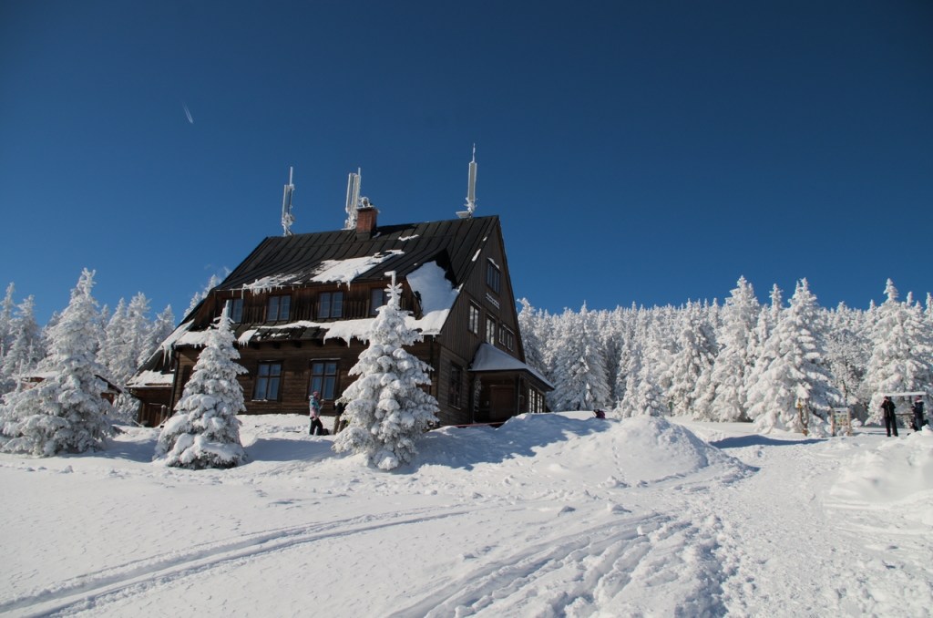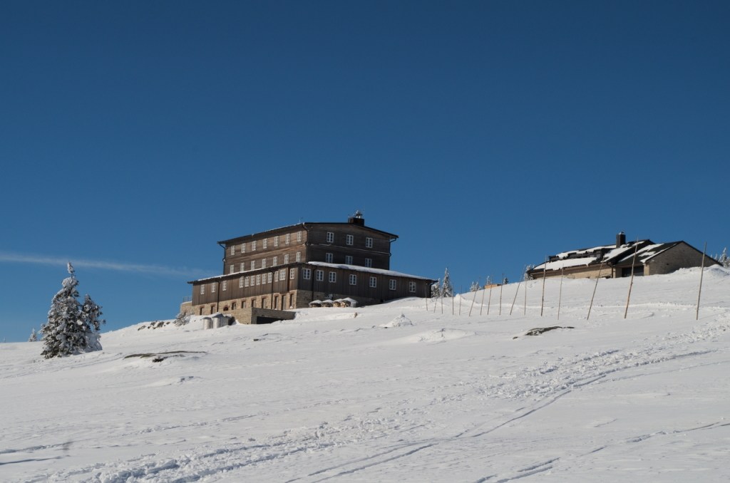 Szlak znów zaczął wspinać się na wysokość powyżej 1400m n.p.m., mijając po drodze odbudowane schronisko Petrova Bouda. W tym miejscu słońce zaczęło tak mocno grzać, że zacząłem ściągać rękawiczki, czapkę, buffy i rozpiąłem kurtkę. Jednocześnie cieszyłem się jak dziecko, że udało mi się tak wstrzelić w tak wspaniałą pogodę.