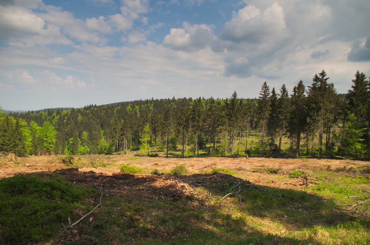 Nasz zielony szlak jest bowiem bardzo rzadko uczęszczany, o czym przekonaliśmy się nie tylko na początku zejścia, gdzie ścieżka była bardzo mało widoczna, ale również nieco dalej, gdzie stan szlaku zmusił nas do jego opuszczenia (zarośnięte przejście, brak ścieżki) oraz przejście na przepiękną, ogromną polanę, którą po czeskiej stronie, wzdłuż granicy, szliśmy blisko godzinę.