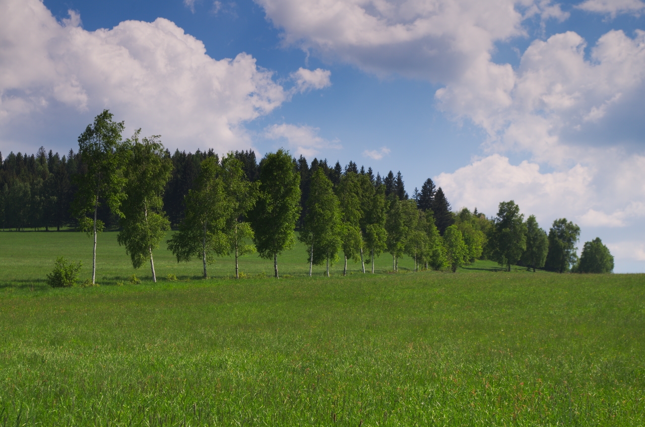 Początek szlaku był stosunkowo nudny, bowiem prowadził on nas asfaltem przez pierwsze trzy kilometry. Jednak im bliżej końca asfaltu, tym teren był ciekawszy. Zamiast domów, kamienic, zaczęły pojawiać się pola i lasy. W międzyczasie połapałem się, że zapomniałem kapelusza, co nie wróżyło zbyt dobrze przy warunkach pogodowych jakie nas czekały.