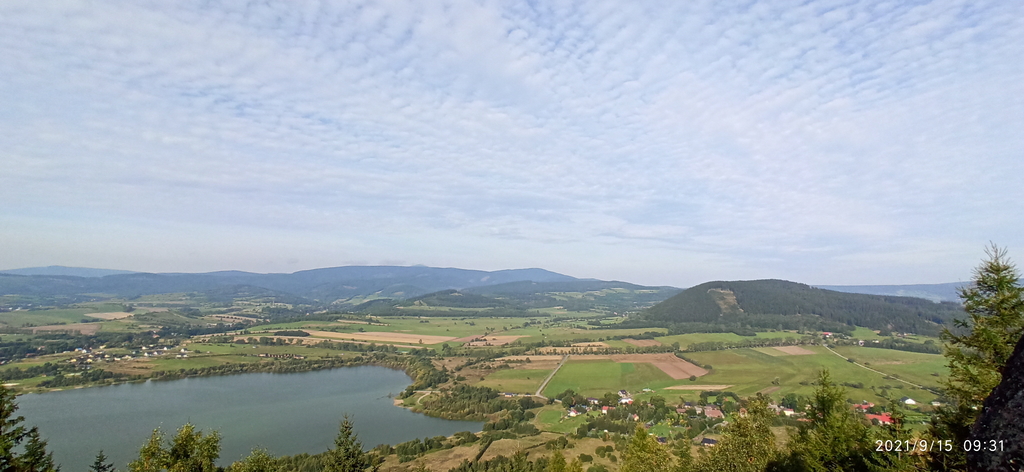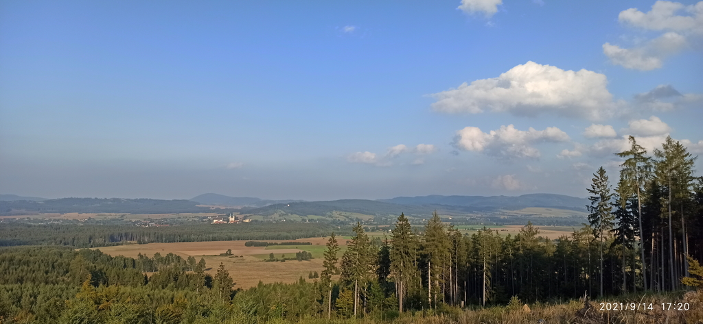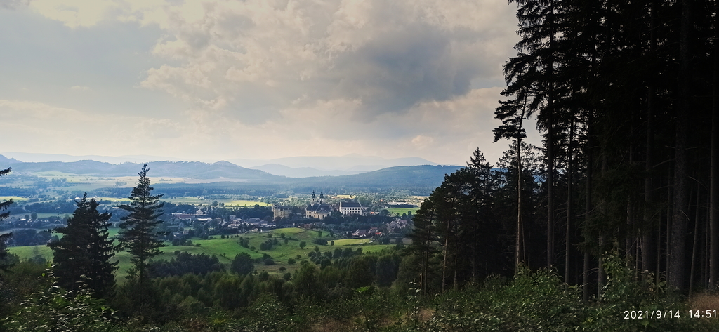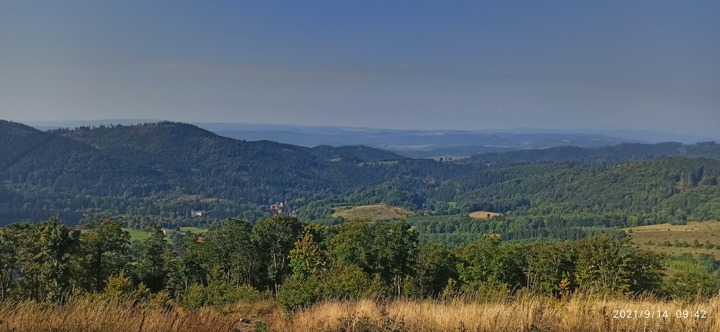 Na pierwszym planie widać było Krzeszów, wraz z mocno wyróżniającym się Sanktuarium Matki Bożej Łaskawej, za nimi Góry Krucze, a w tle dumnie stała Śnieżka. Trochę żałowałem, że nie miałem przy sobie aparatu, bo miejscówka ma ogromny potencjał. Aczkolwiek w tamte okolice na pewno wrócę, chociażby po to, by zwiedzić kiedyś sanktuarium. Zresztą Sudety są tak ciekawym terenem, nie tylko pod względem szlaków górskich, że zwiedzić wszystkie ciekawe miejsca, to naprawdę sporo czasu by zajęło.