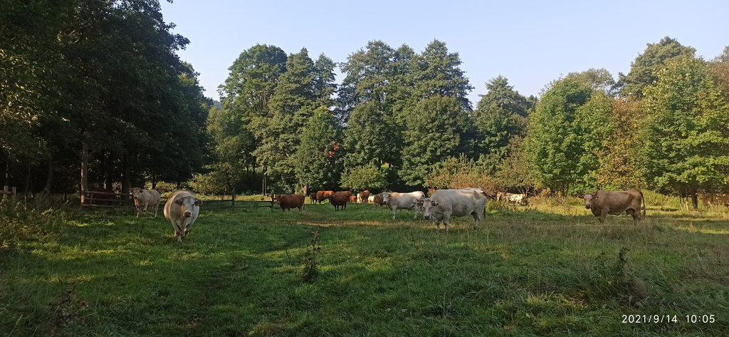 Zaraz za zejściem szlak przechodzi przez niewielkie pole. Gdy tam doszliśmy wywołaliśmy niemałą sensację wśród… bydła, które tam się pasło. Miałem też wrażenie, że nie jesteśmy zbyt mile widziani w tym miejscu. Po krótkiej chwili rozważań, czy jesteśmy w stanie obejść to miejsce, postanowiliśmy, że jednak musimy przejść między nimi.