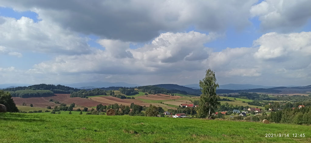 Kolejnym etapem wędrówki było zejście do miejscowości Grzędy Górne. Przy okazji schodzenia w dół, pojawiło się kilka przecinek w lesie, które zafundowały nam przepiękne widoki. Po raz kolejny, w tle, moim oczom ukazały się Karkonosze ze Śnieżką na czele. Tym razem były już znacznie bliżej.