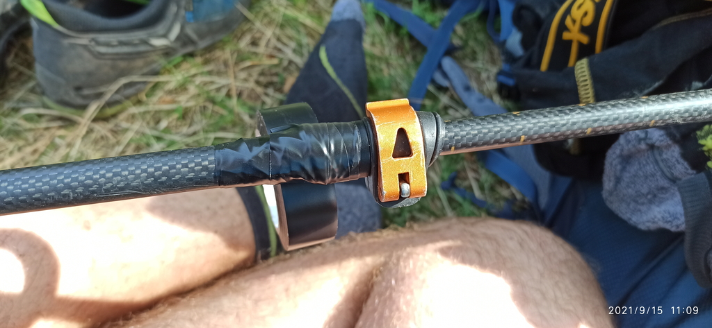 Gdy przedarliśmy się przez resztki iglaków, zaczęliśmy podejście na Świerczynę, na której zarządziłem przerwę na drugie śniadanie i reanimację kijka. Z kijkiem miałem problem od kilku dni, ponieważ jeśli był chociaż odrobinę bardziej grząski grunt, to dolna końcówka kijka ,,uciekała” od reszty. A ponieważ nie wyobrażałem sobie zgubienia tej końcówki i dalszego marszu bez kijka, wpadłem na pomysł, że mogę podkleić dwa elementy kijka taśmą izolacyjną. Jak się okazało, był to dobry pomysł i kijek wytrzymał do końca szlaku.