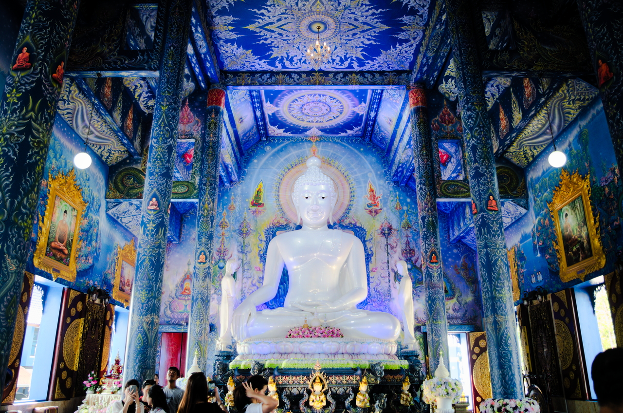 Niebieska Świątynia to moim zdaniem najpiękniejsza świątynia buddyjska, którą widziałem do tej pory. Znów niesamowita gra kolorów i światła, do tego wspaniałe malowidła w całej świątyni i biały posąg buddy na tle niebieskiego koloru, który był wokół. Robiło to nieprawdopodobne wrażenie. Miało to w sobie jakąś taką moc, która powodowała, że nie miałem ochoty wychodzić ze świątyni… a może to ta klimatyzacja.