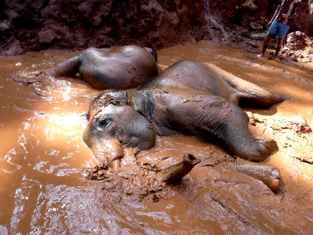 Po sjeście ruszyliśmy w stronę bajorka, w którym czekały już słonie. Podobno taplanie i masowanie ich w błocie, należy do tych czynności, które te słonie uwielbiają. Tak więc każdy z nas zaczął okładać słonie błotem, a następnie je masować. Pierwszy raz w życiu miałem okazję poczuć strukturę skóry słonia, dotknąć go, niezapomniane przeżycie.