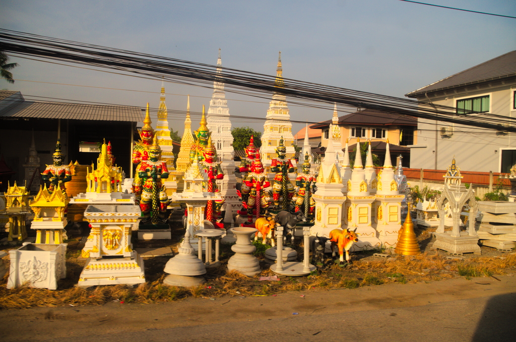 Sam przejazd jest dość ciekawy, zza okna autobusu można oglądać przedmieścia Bangkoku, mija się ciekawe fabryki, na przykład fabrykę posągów, które można podziwiać w świątyniach buddyjskich i hinduskich, fabrykę kapliczek, które można spotkać na każdym kroku w Tajlandii. Jest to o tyle ciekawe, że wyroby gotowe stoją pod gołym niebem. My zaś zdecydowanie przykuwaliśmy uwagę miejscowych, chyba niewiele turystów kusi się na taką formę podróży.