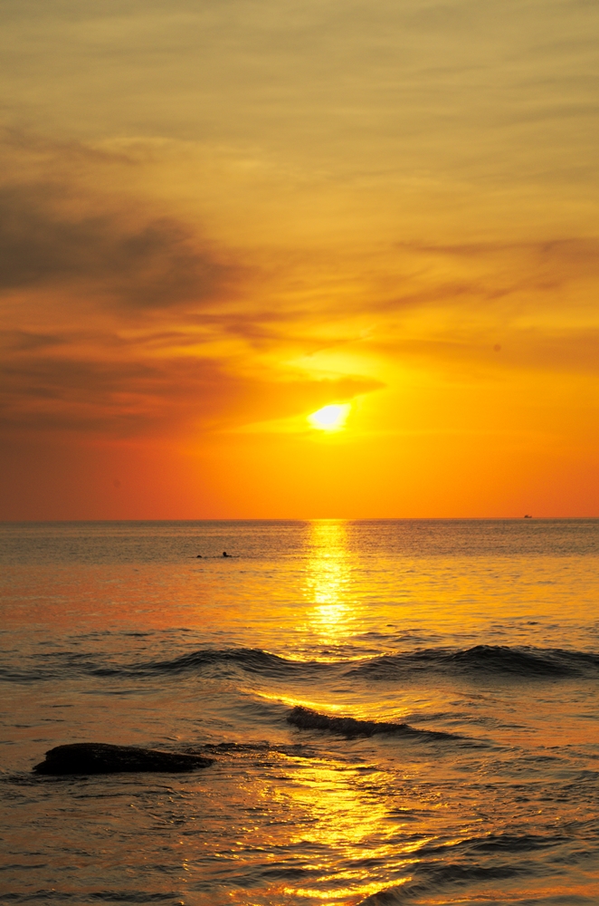 Po zameldowaniu udaliśmy się na plażę Kata Noi na zachód słońca. Przy okazji dowiedzieliśmy się, że nie będzie tutaj już tak tanio jak w Chiang Mai, a lepszym sposobem na porozumiewanie się będzie łamany rosyjski z domieszką polskiego, niż język angielski. Serio, jest to pierwsze miejsce w Tajlandii, w którym wszelkie napisy były w języku Tajskim, Rosyjskim, Angielskim, rzadziej Chińskim.