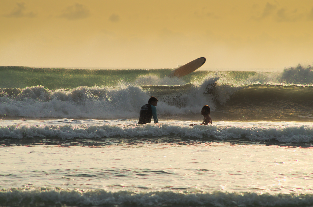 Teoria i praktyka ,,na sucho” była dość szybka i zrozumiała, nadszedł zatem czas na wejście do wody i tutaj zaczęły się cyrki. Z falami walczyliśmy ponad godzinę z różnymi efektami, ale raczej bardziej w stronę kiepskich niż pozytywnych.