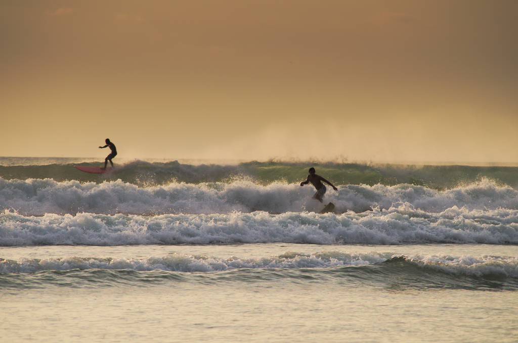 Jeszcze przed całkowitym zmrokiem ruszyliśmy na spacer, po czymś rodzaju nadmorskiej promenady, gdzie aż roiło się od oferty szkółek surfingowych, z których mieliśmy skorzystać następnego dnia. Szkółki już powoli się zwijały, ale to był dość dobry moment na zapytanie o oferty szkółek i wybranie najbardziej korzystnej. Ceny były bardzo różne, zazwyczaj szkółki oferowały cuda na kiju albo zwrot pieniędzy (ta jasne), ale o tym później. Tak czy siak dowiedzieliśmy się, że najlepsze warunki do nauki panują rano, co akurat potwierdzało moje przypuszczenia, bowiem zazwyczaj mam takie skojarzenie, że to właśnie przed południem morze jest znacznie spokojniejsze niż popołudniu.