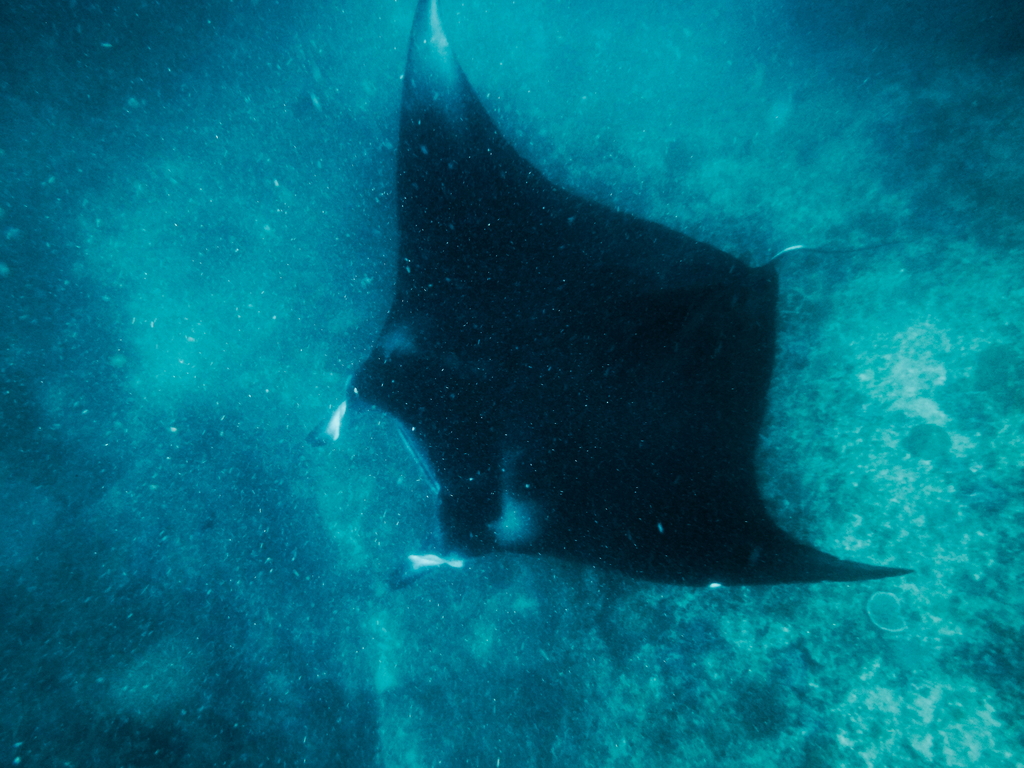Po około godzinie rejsu dopłynęliśmy do pierwszego spotu. Pierwszego, najbardziej epickiego i niestety najbardziej tłocznego, bo o ile w pozostałych przypadkach wycieczki rozdzielają się po całym wybrzeżu wyspy Nusa Penida, o tyle wyłącznie w jednym miejscu można spotkać największą atrakcję tego dnia, czyli Manty, znane również pod nazwą Diabła Morskiego.