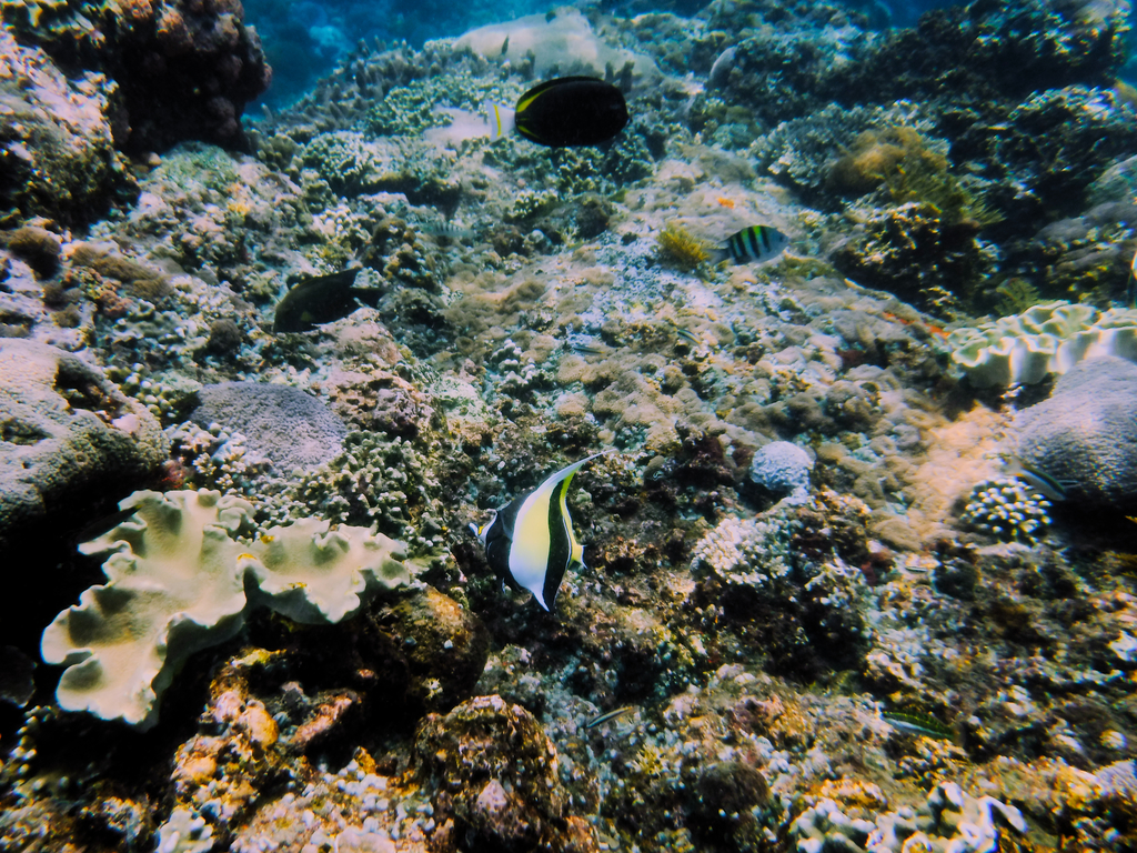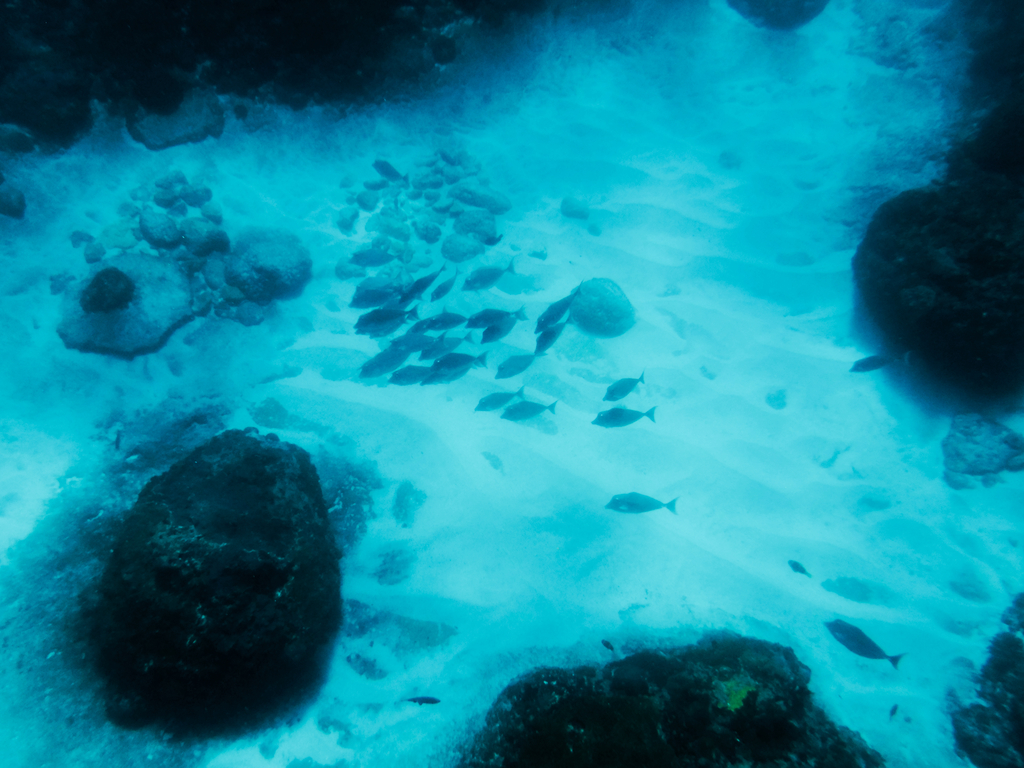 Drugi i trzeci spot był już znacznie spokojniejszy. W obu przypadkach był to przystanek w niewielkich zatoczkach z cudownie turkusową wodą, w której widoczność sięgała, no w sumie to nie wiem jakiej głębokości, ale myślę, że spokojnie było tam z 15m. Tego typu spotów jest dość sporo, dzięki czemu nie było już tak tłoczno jak w przypadku pierwszego punktu. Aczkolwiek w tych zatokach nie było już Mant, ale za to była cała masa innych, przepięknych rybek i to w niektórych przypadkach całych ławic. Podobno przy skałach zauważono także żółwia, ale niestety to przegapiłem.