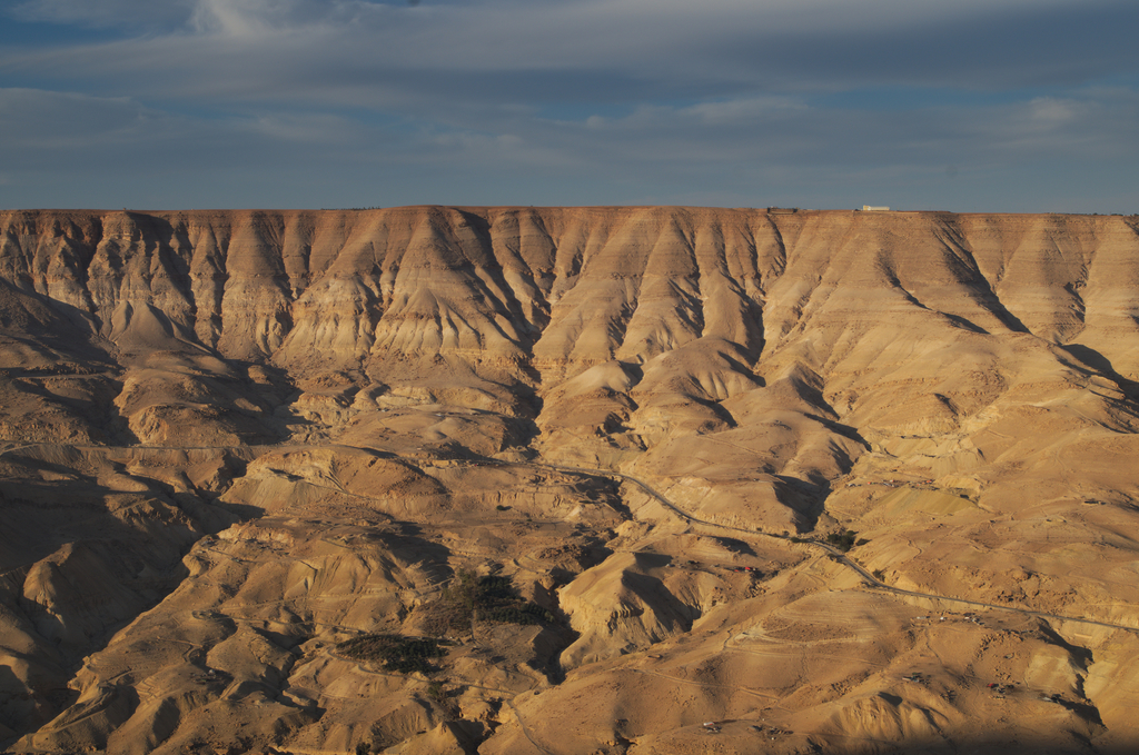 W tej sytuacji nie mieliśmy wyjścia i musieliśmy wybrać tą opcję podróży. Już po kilkudziesięciu kilometrach dotarliśmy do przepięknego punktu, z którego rozpościerał się widok na dolinę Moujib. Jak się okazało droga zjeżdża na dół doliny i przejeżdża przez tamę Almujib Dam, po to by za chwilę ponownie mocno się wspiąć ponad dolinę. Już w tym miejscu mieliśmy pewność, że dużo lepiej jechałoby się w takich warunkach na manualu, a nie na automacie. Zwłaszcza, że nasze hamulce, powiedzmy delikatnie, że miały lata świetności za sobą.
