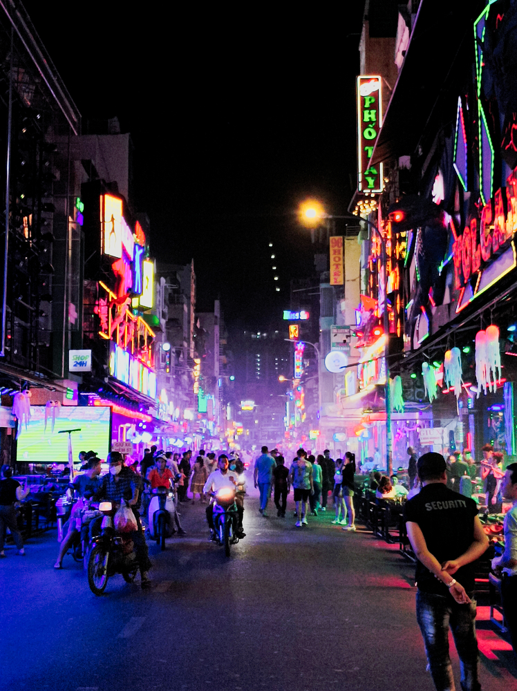 Wieczorem proponuje wybrać się w jeszcze jedno miejsce. Bui Vien Walking Street jest to imprezowe serce Sajgonu. Znajdują się tutaj dziesiątki różnych klubów, w których można siąść, napić się alkoholu, potańczyć lub pooglądać co nieco. Jednakże idąc tutaj musisz nastawić się, że ceny, nawet prostego piwa, jak na Wietnam są skrajnie wysokie. W klubie, w którym byliśmy ceny były mniej więcej takie jak na rynku w Krakowie, ale mimo to, na jedno, dwa piwka warto się wybrać, by poczuć klimat, który tutaj panuje.