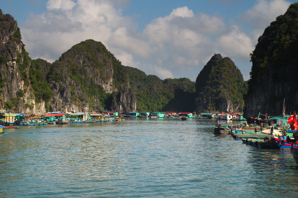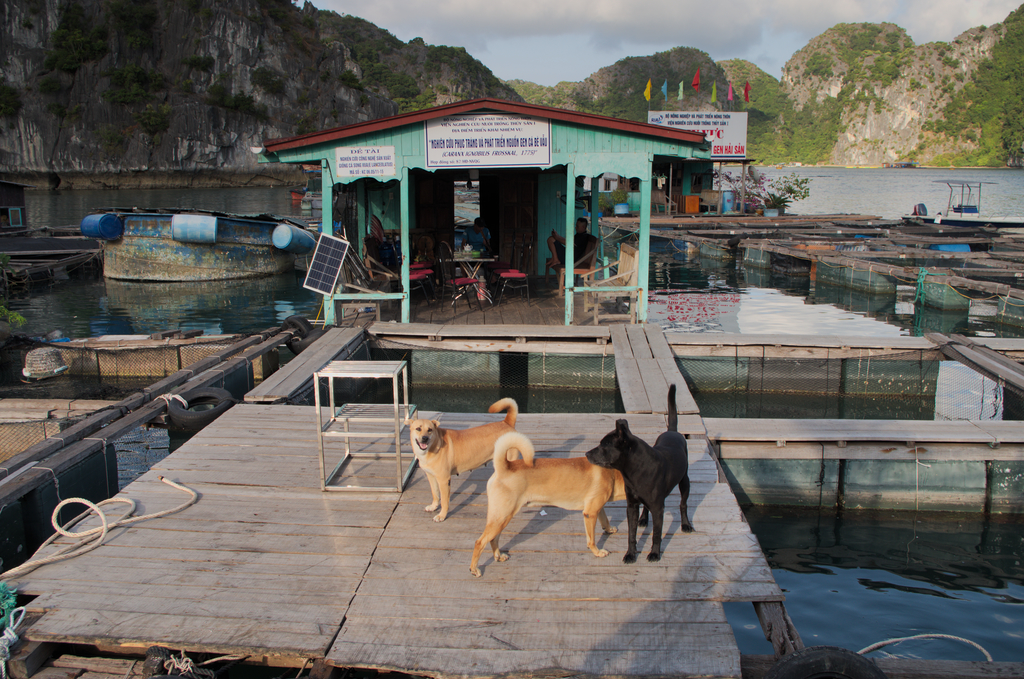 Przerwa w zatoczce minęła bardzo szybko i czas było ruszać w dalszy rejs. Ostatnim naszym przystankiem była wioska rybacka. Są to malutkie, pływające wioski. W zależności od wielości na wysepce takiej znajduje się parę domków, czasami sklepy, warsztaty, a nawet niewielkie przetwórnie ryb. A ponieważ zatrzymaliśmy się w wiosce, skierowanej pod turystów, to znaleźliśmy tutaj tylko dwa domki, psa i kilka basenów, w których hoduje się ryby.